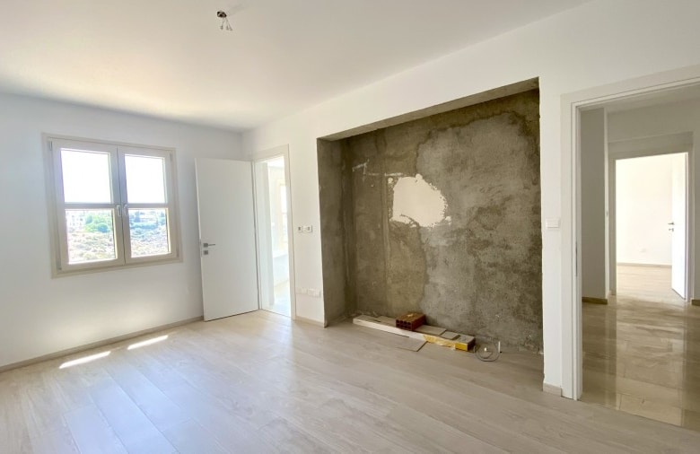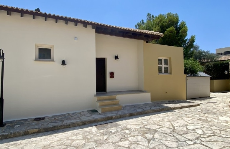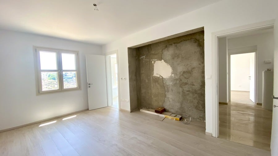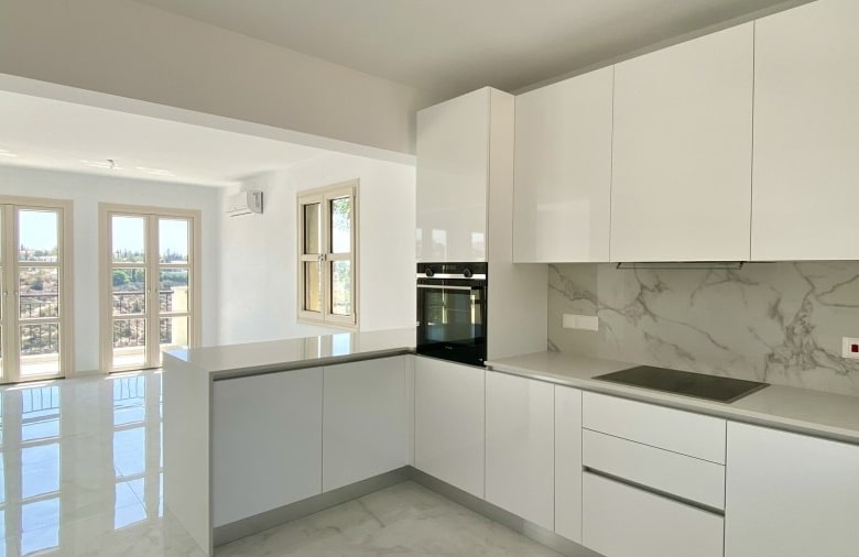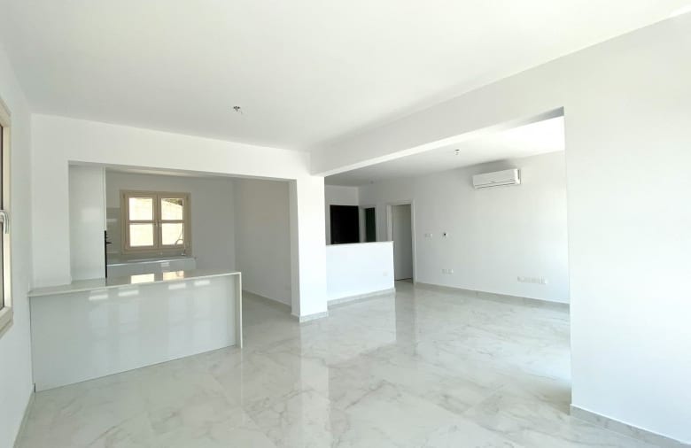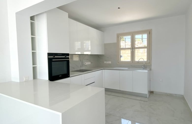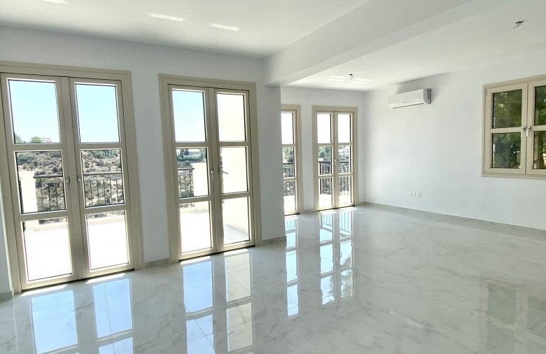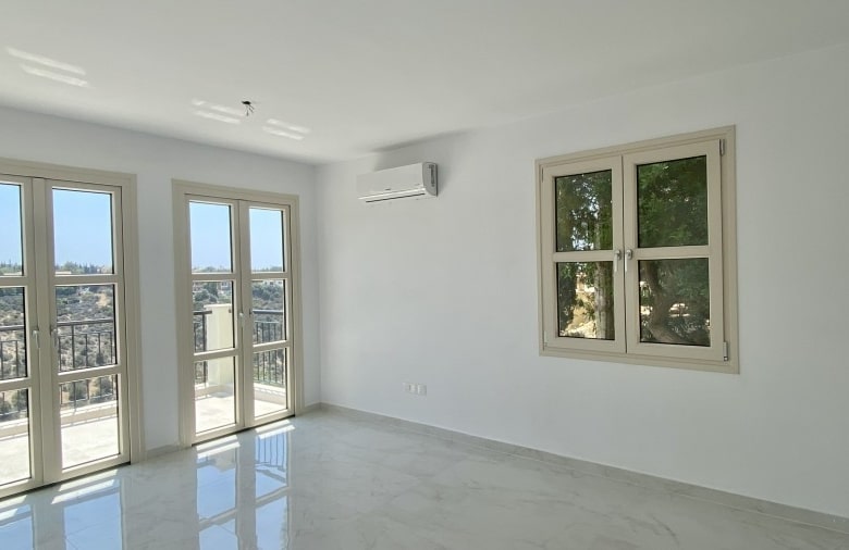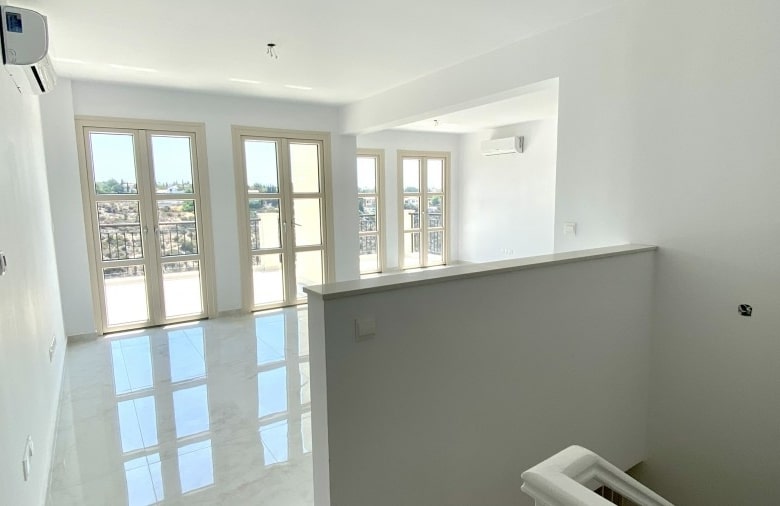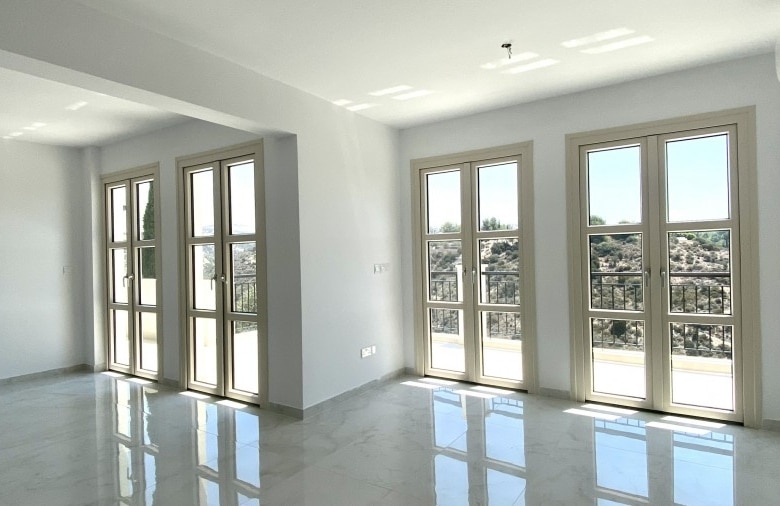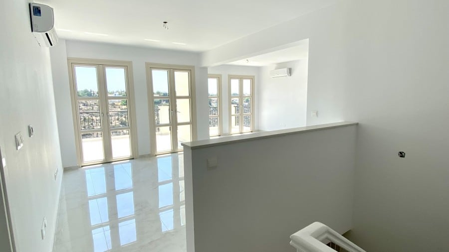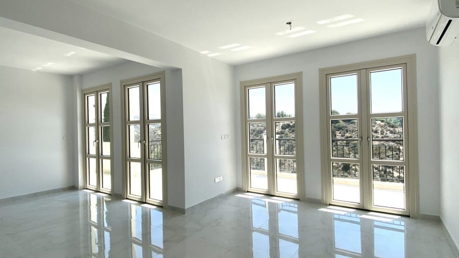 A stunning total renovation of a three bedroom, three bathroom semi detached villa in the heart of the Aphrodite Hills PGA Golf Resort. The property enjoys stunning panoramic views to the Eastern Plateau and a large private garden. It will be finished with a 6m x 3.5m surface pool. The property has new floors throughout with underfloor heating, all new doors and windows and a new kitchen with Siemens fitted appliances. Each bedroom has its own ensuite shower room/wet room. The master bedroom has a unique en suite 5 piece bathroom with free standing bath, shower, bidet, wc and vanity units looking out from the bath over wonderful ravine views through its own French doors. Located at the end of a quiet cul de sac, you enter the villa at first floor level where the panoramic views immediately hit you. The large open plan living room has multiple French doors leading onto the terrace. It opens onto a spacious open plan kitchen with white granite work surfaces and Siemens appliances. Throughout the villa the windows and French doors have all been replaced as has the air conditioning units which are all the latest inverter design. There is also underfloor electric heating beneath the large white granite floor tiles throughout. On this floor there is a guest cloakroom together with a double bedroom with ensuite shower wet room facing the ravine. On the large terrace there are lovely views across the ravine to the Eastern Plateau and down to the sea. A marble staircase takes you down to the lower hallway where there is access to the two further bedroom suites. To one side there is the master bedroom with wardrobes and access to its own unique master suite with a freestanding bath looking out over the ravine to the sea! On the other side of the hallway is the second bedroom suite which also has French doors opening onto the garden area. The garden is a good size and lends itself to many possibilities. There is also a raised garden area and a large raised walled patio area. The swimming pool will be sited on the raised concrete platform with wooden panels.