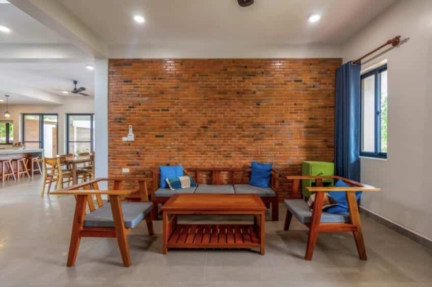 • Living Area: Minimalist design highlighted by a brick accent wall