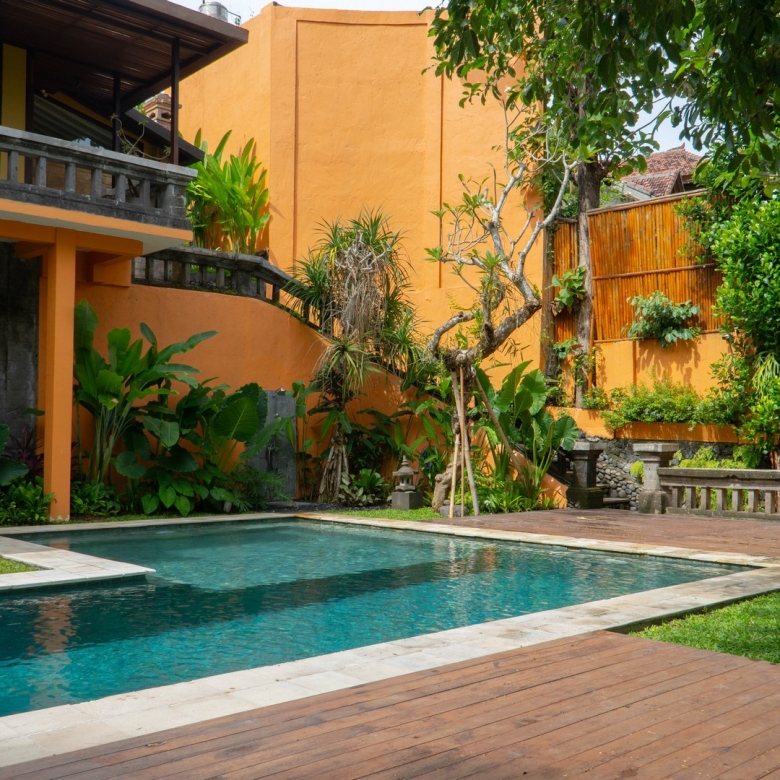 The villa faces east-south and captures soft light throughout the day. A private pool sits at the edge of the garden with direct views of the river, while access is via a 5-meter-wide public asphalt road. There’s also a garage for one car, PDAM water connection, and tourism zoning already in place for added flexibility.