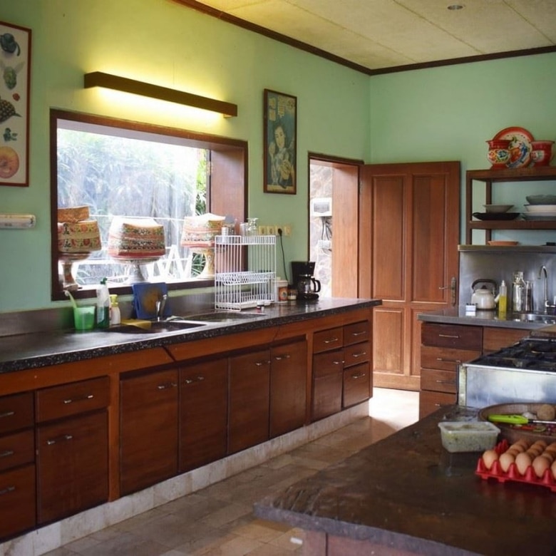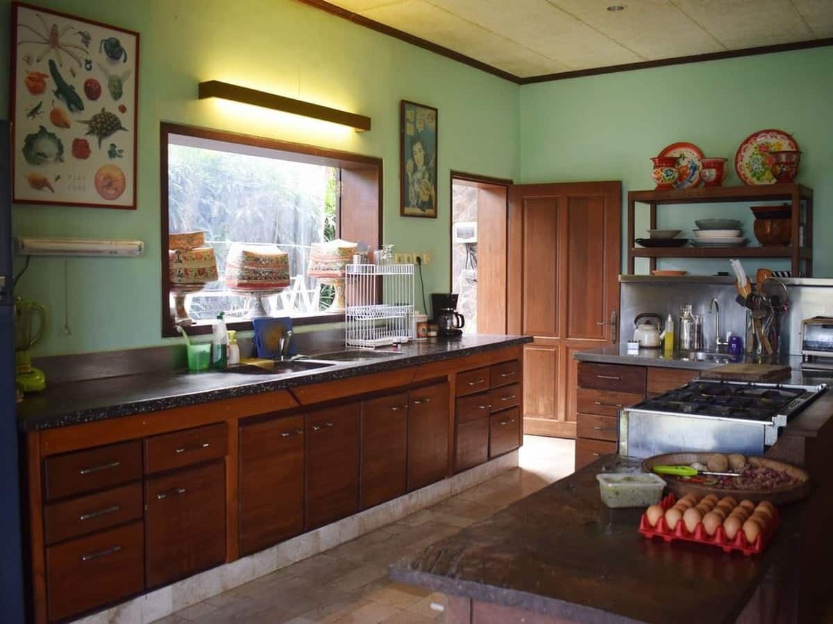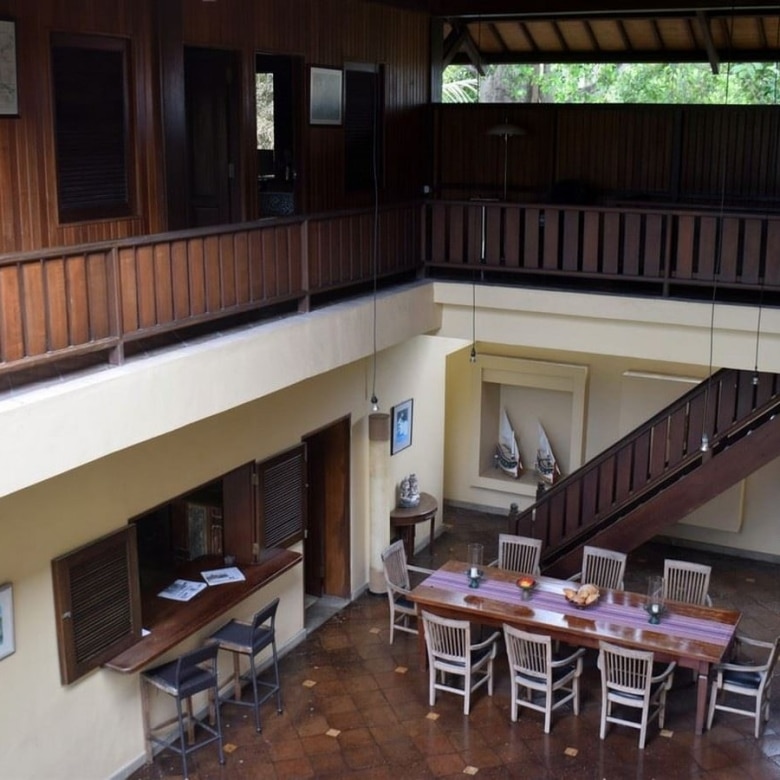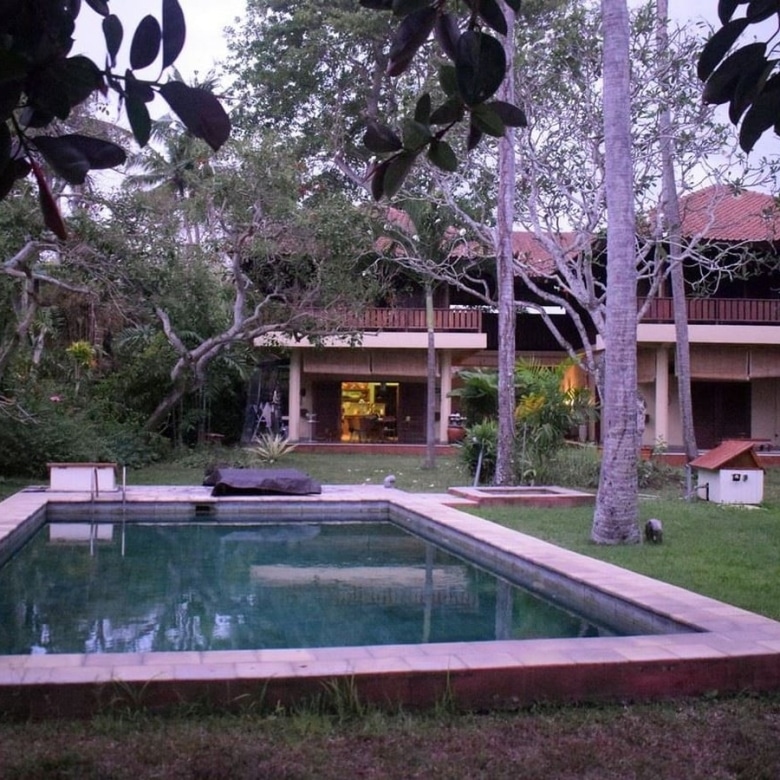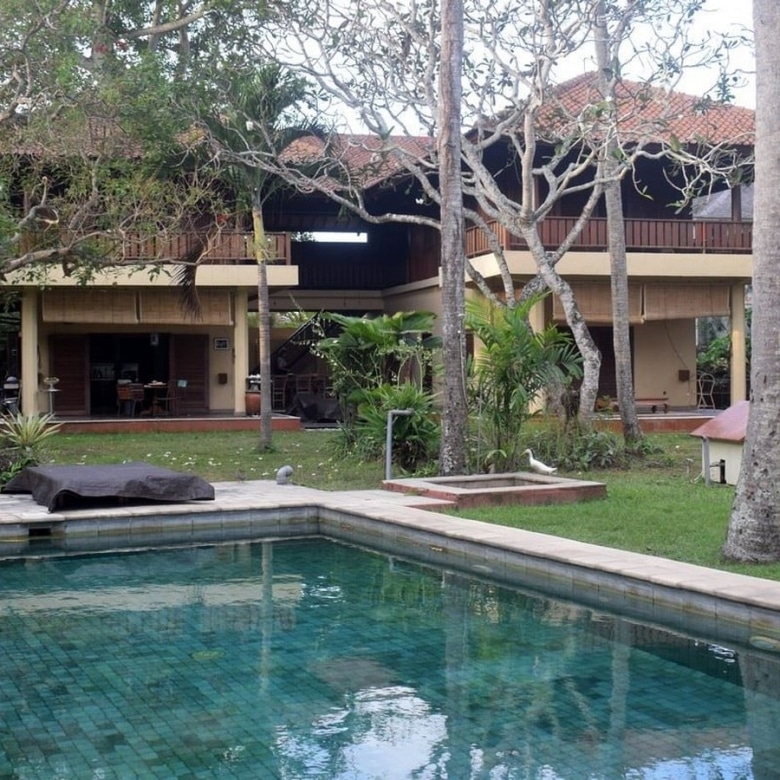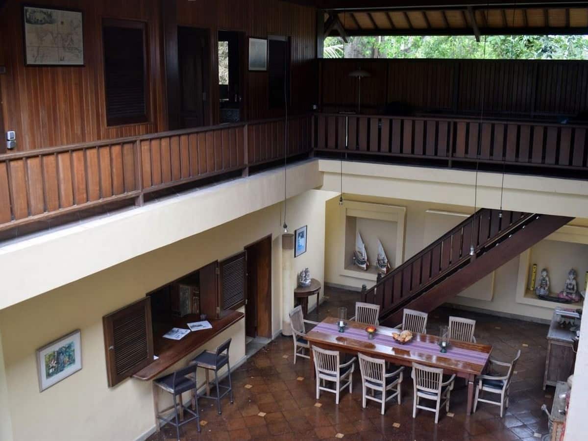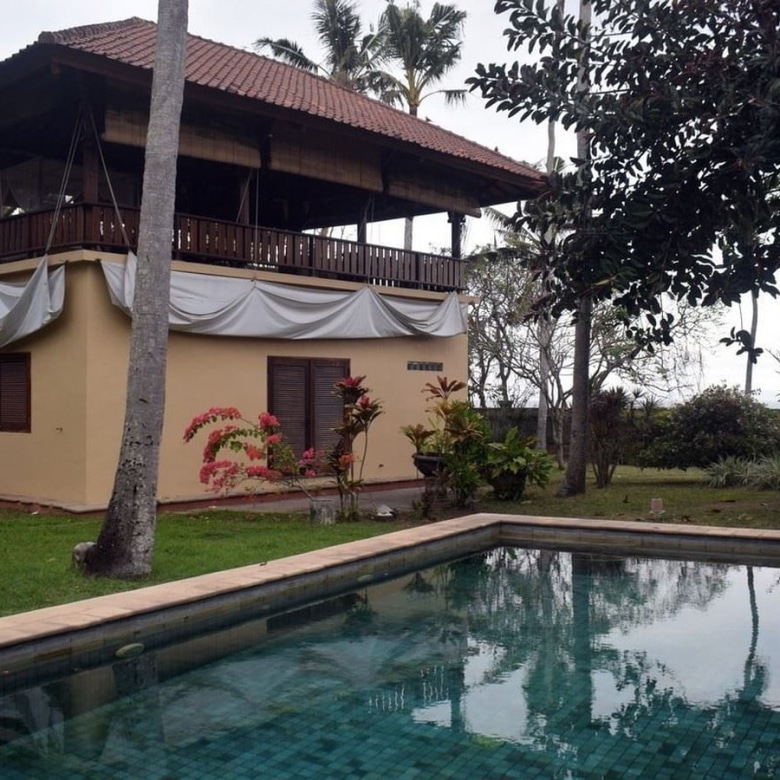 The separate guest house has a similar two-story structure with a 45 Sqm bedroom downstairs and an equally large living upstairs with dining, kitchenette, and ‘daybed’ in open tropical style. Surfers can check on the waves from here. Downstairs there is an open-air bathroom. The 5×10 metre pool is the central feature, nestled amongst a mature garden.