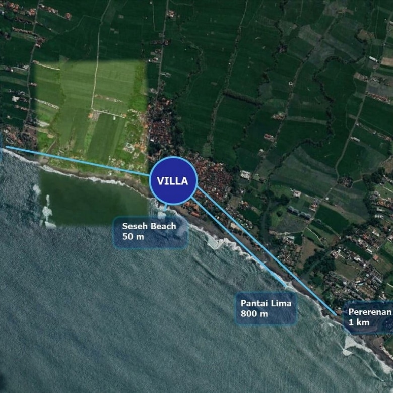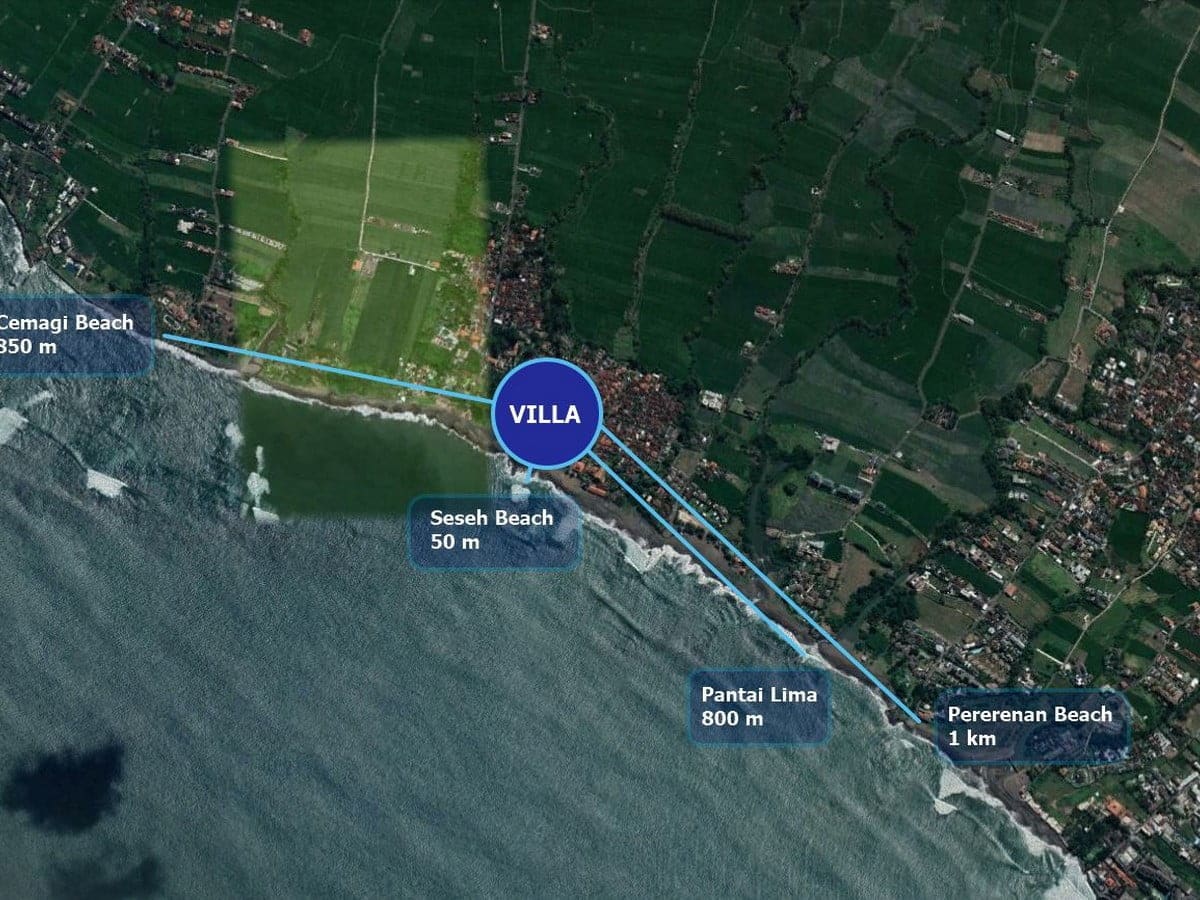 Situated just back from one of Bali’s finest beaches, a direct path leads from the property down to Seseh beach (50m). The villa blends unobtrusively into the landscape and is located between a sacred temple and other luxury villas, guaranteeing privacy and security.
