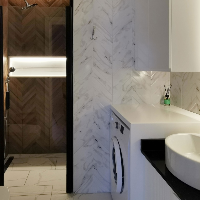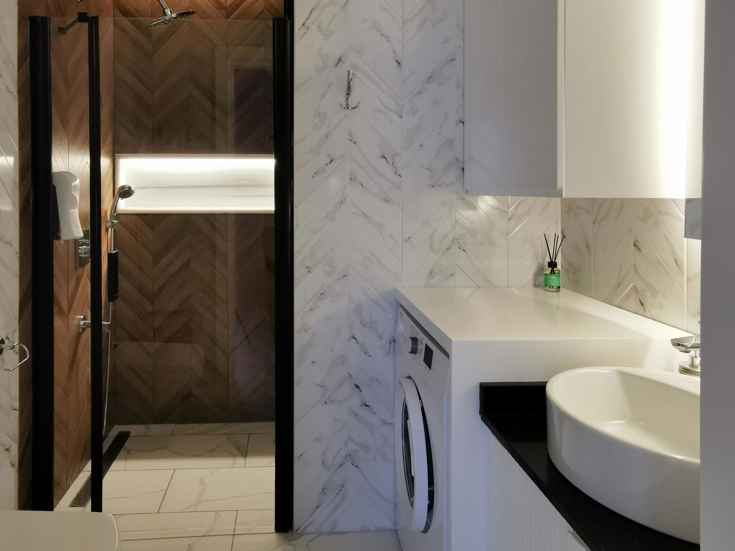 Walls & Floors:Light beige tones on walls and glossy ceramic tiles throughout create a bright and spacious atmosphere.