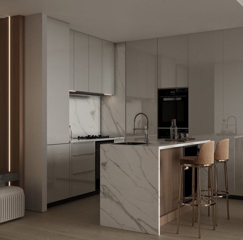 • Kitchen: Fully fitted with premium materials, including walnut wood and nano statuary finishes.