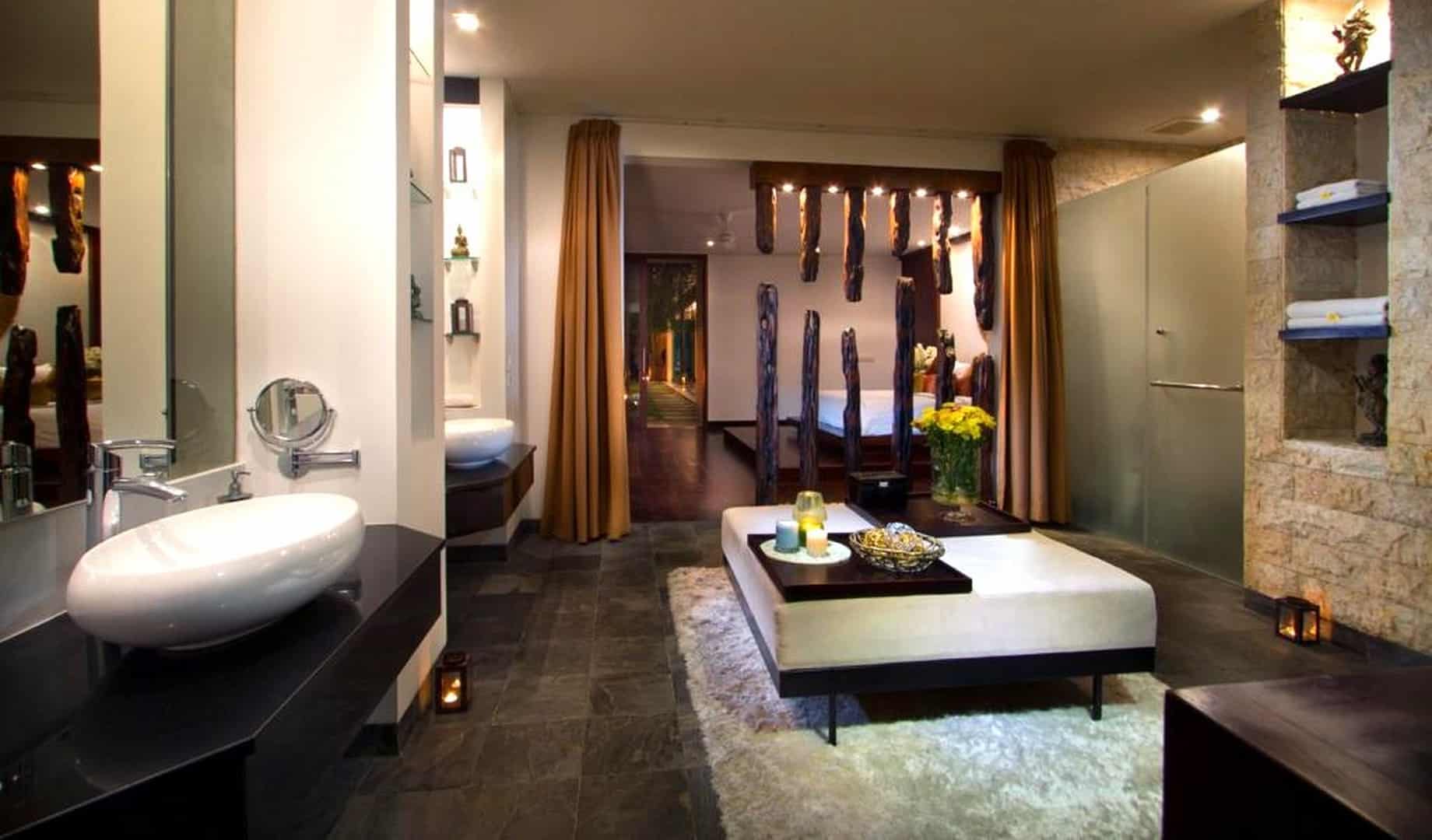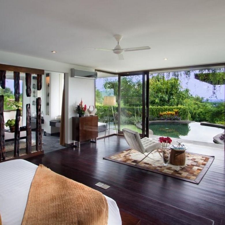 Be greeted by a water fountain and lily ponds as you enter this stunning property and walk through the 4-metre-tall copper and brass door to a collection of Indonesian art adorning the 35-metre hall of beautifully laid stonework to reach the foyer. The open plan living areas highlight the lush gardens and large 25m x 7m (1.5m – 3m deep) infinity pool with its own bale and fire features. Gasp at the view expanding the entire 20 metre length of the living and dining space to the gardens, pool and ocean beyond. The main dining room has a “saurwood” 4.5 metre dining table that seats 12 comfortably. The frameless glass door can be closed for air-conditioned comfort or else leave it open to enjoy the outdoor living space and the cool breezes.