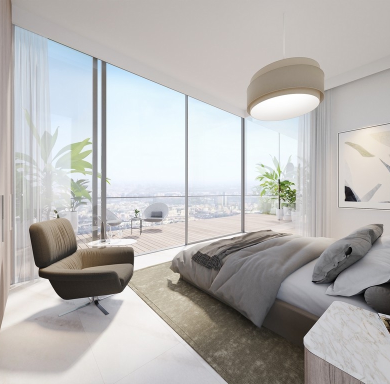 Bedrooms with large windows, neutral palettes, and private balconies for ultimate relaxation