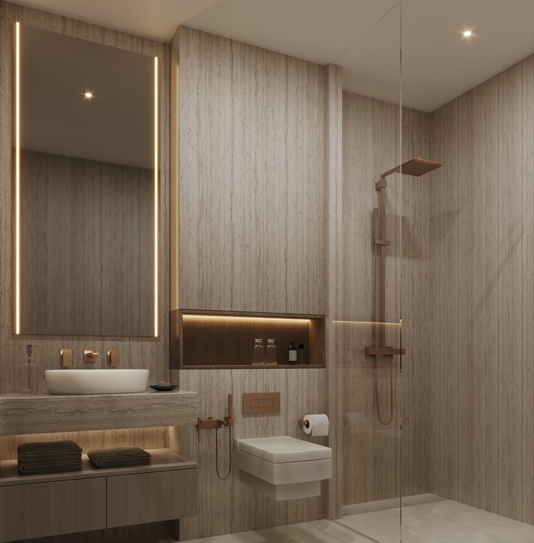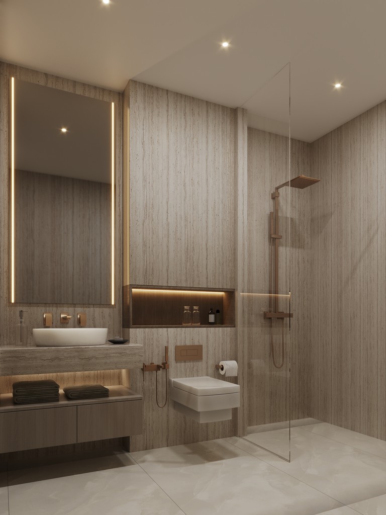 • Bathrooms: Modern fittings with elegant stone and brass accents.