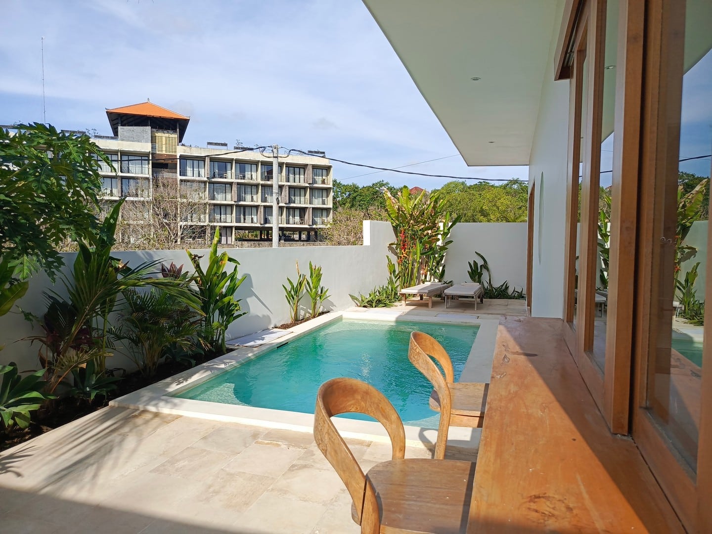 Outside, the villa features a private plunge pool with ocean views and an outdoor bar area, perfect for entertaining or relaxing after a day in the sun. The tropical garden enhances the sense of tranquility, creating a private oasis.