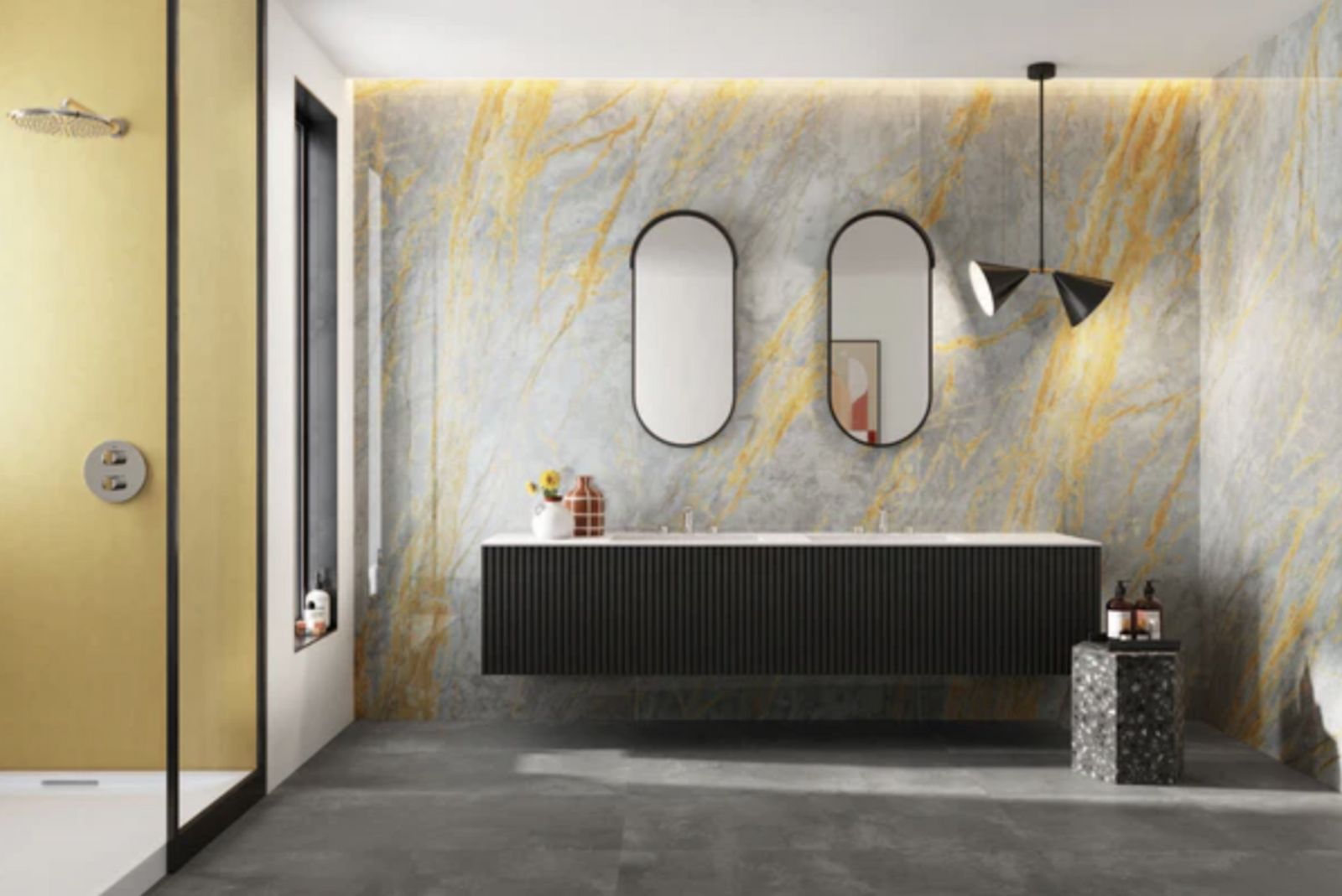 Full bathroom in the hallway with shower, modern and contemporary.