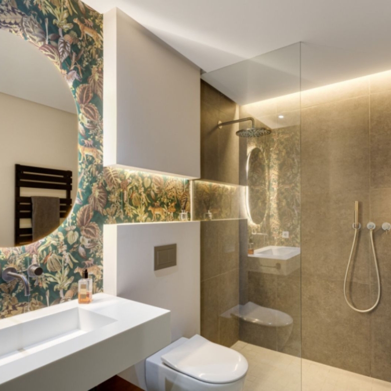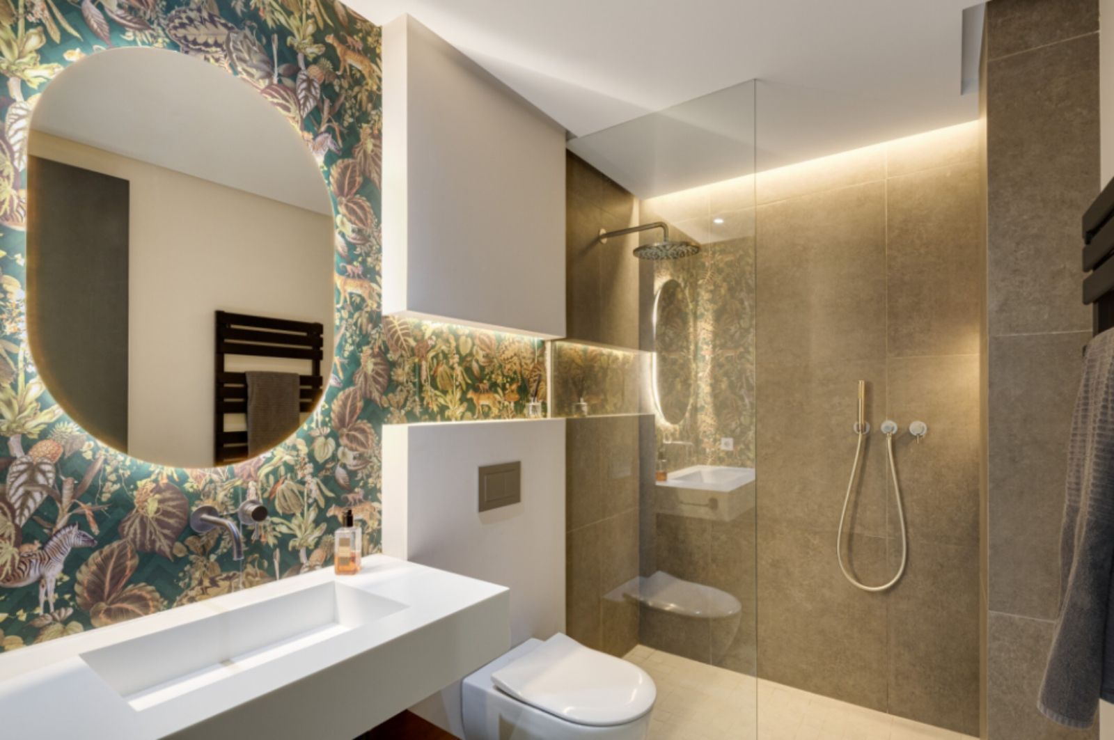 The second bathroom comes with a corner shower and a small storage area housing the washing machine.