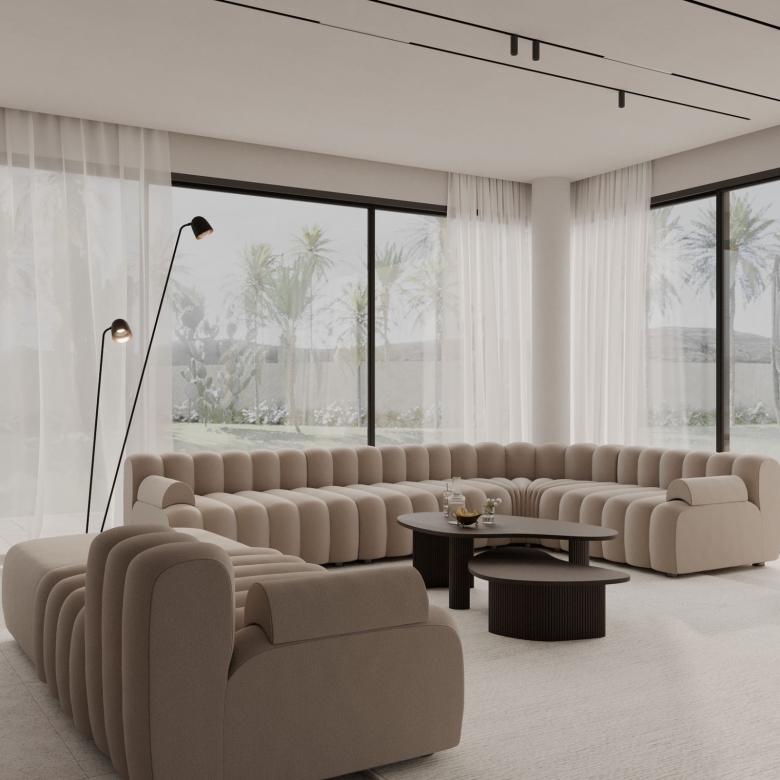 Entering the apartment, you are welcomed by a large lounge with dining area and direct access to the very spacious terrace with glass curtains, giving you use all year round.