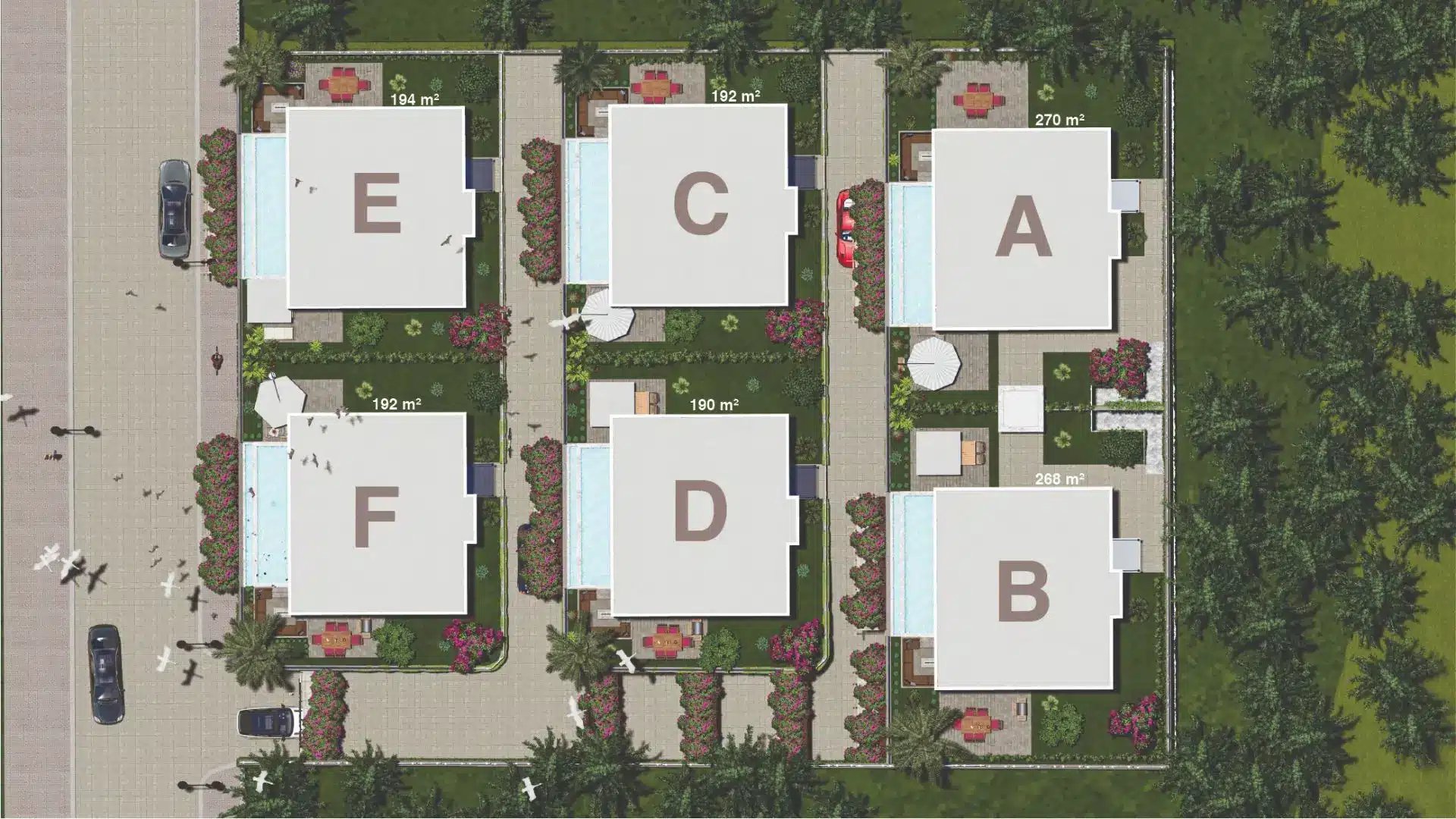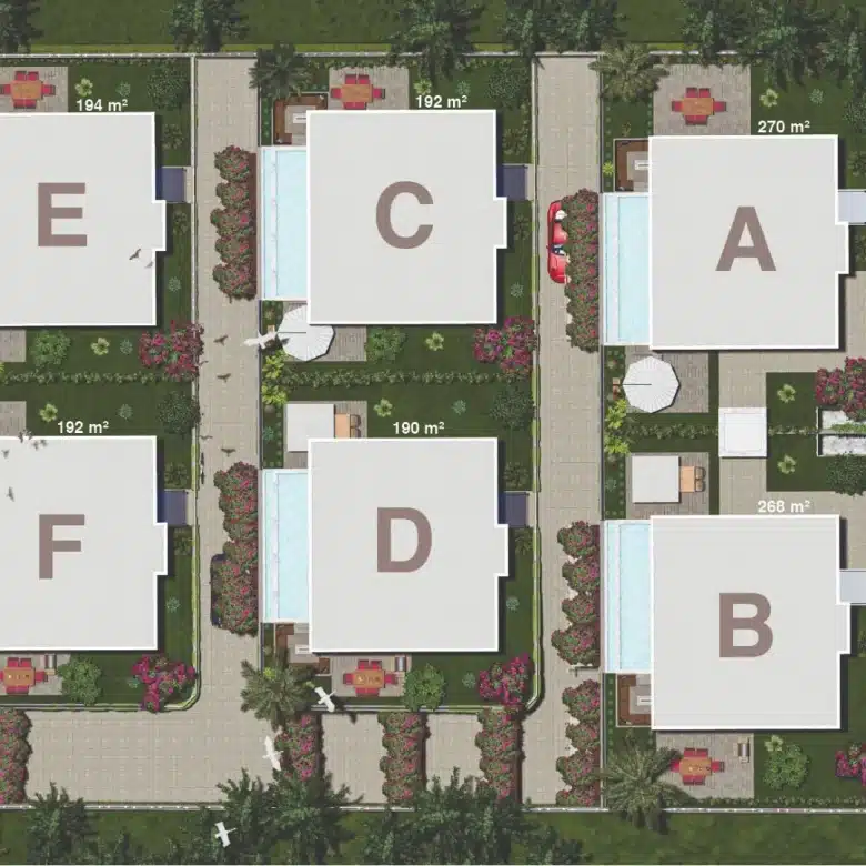 – Six Triplex Villas: Each villa offers 305 m² of living space configured in an 8+1 layout, complete with four master bedrooms.