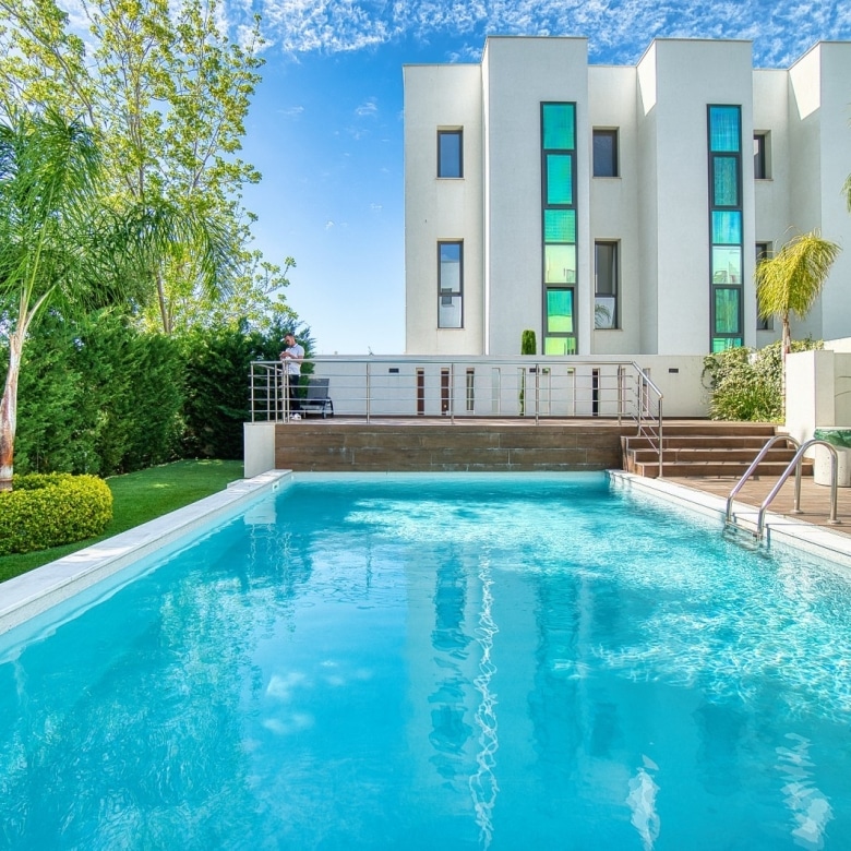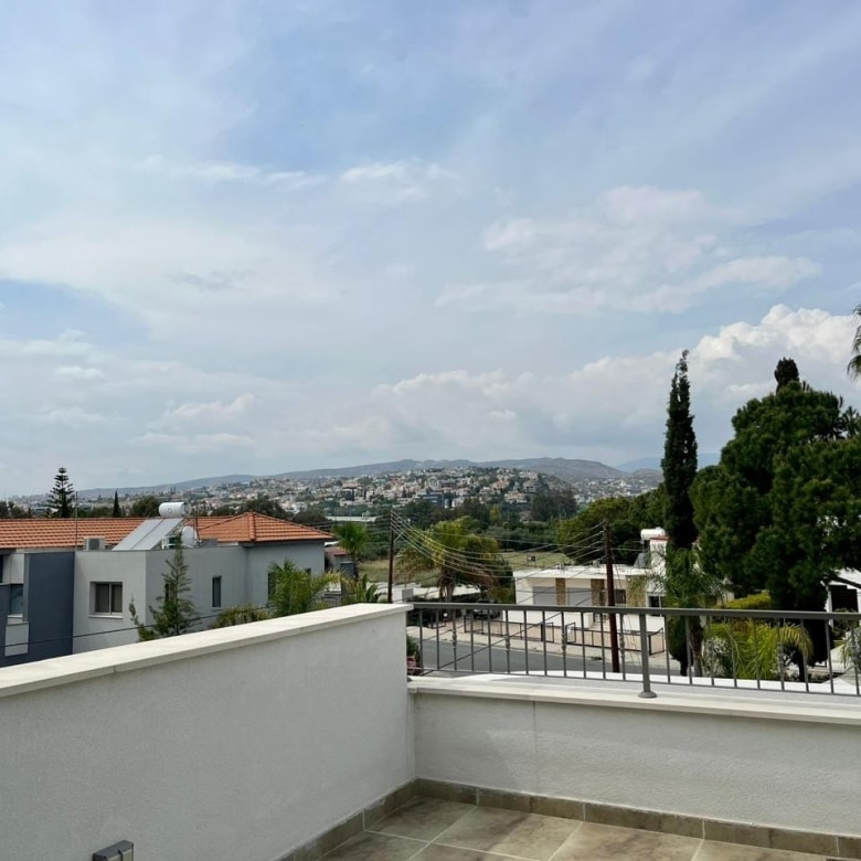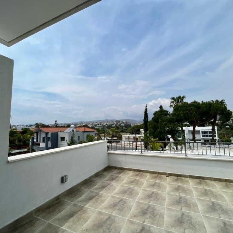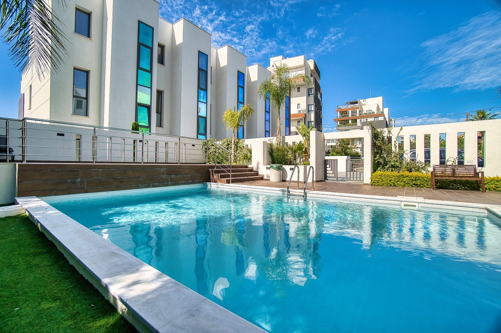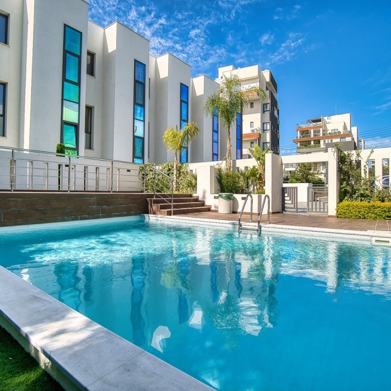 The complex features a swimming pool area surrounded by trees, with a wooden terrace equipped with sunbeds and umbrellas, creating an ideal spot to relax and soak up the warm Cyprus sunshine.