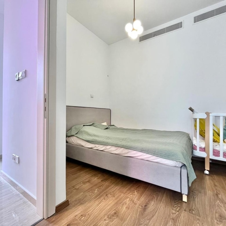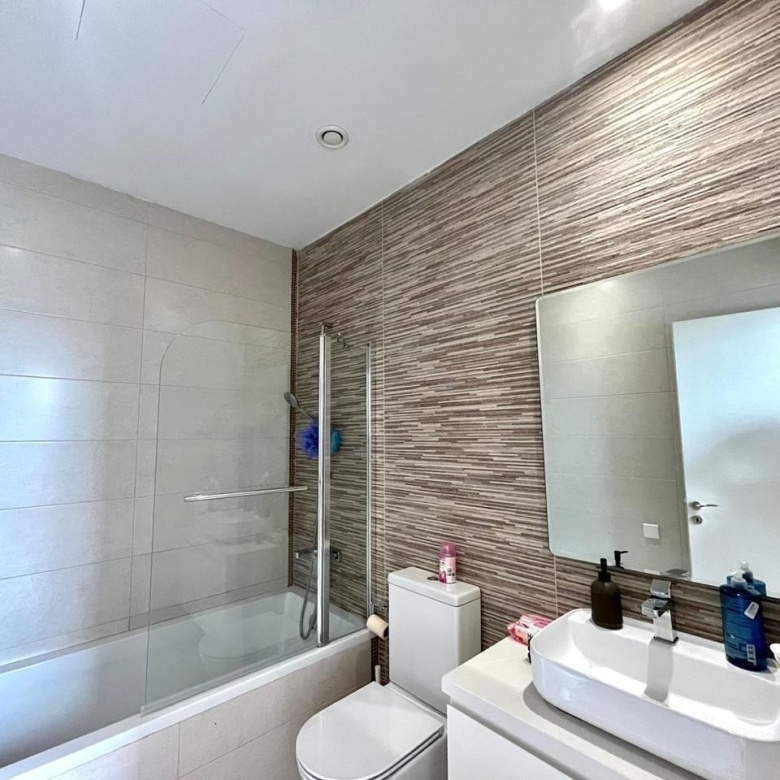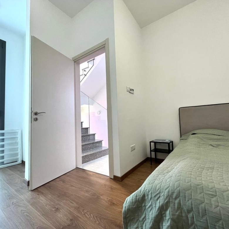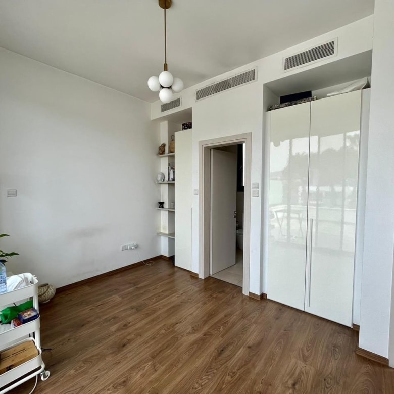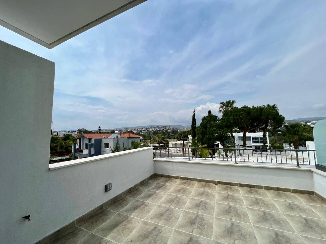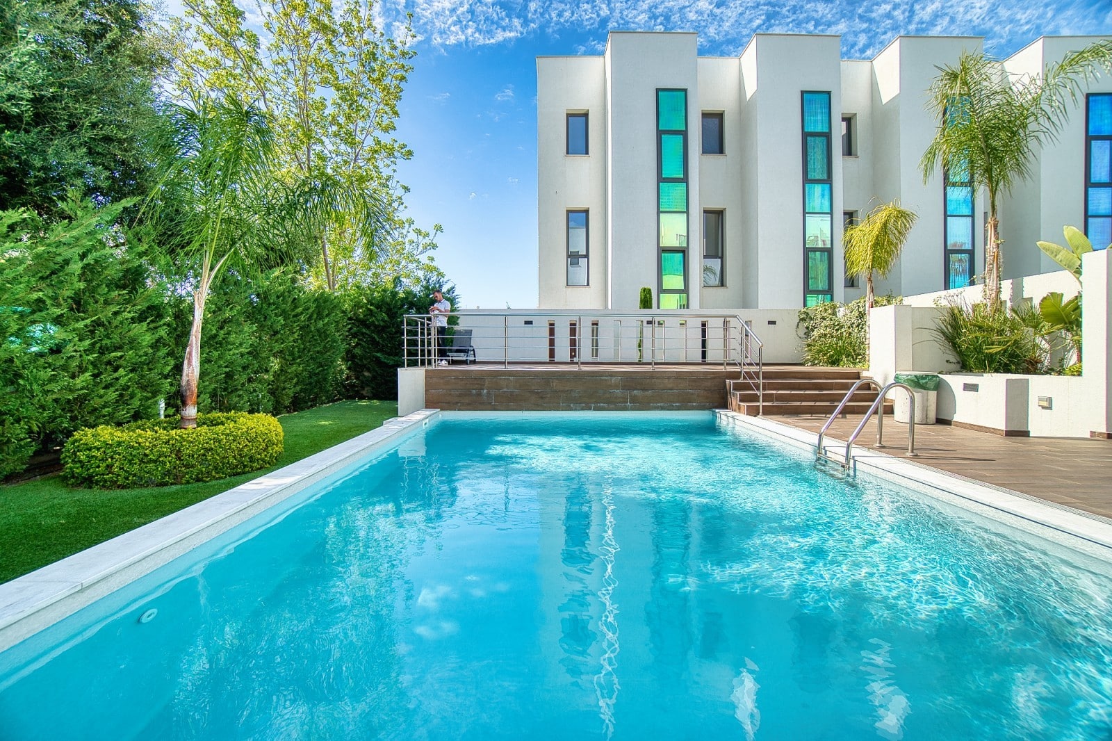 The complex features a swimming pool area surrounded by trees, with a wooden terrace equipped with sunbeds and umbrellas, creating an ideal spot to relax and soak up the warm Cyprus sunshine.