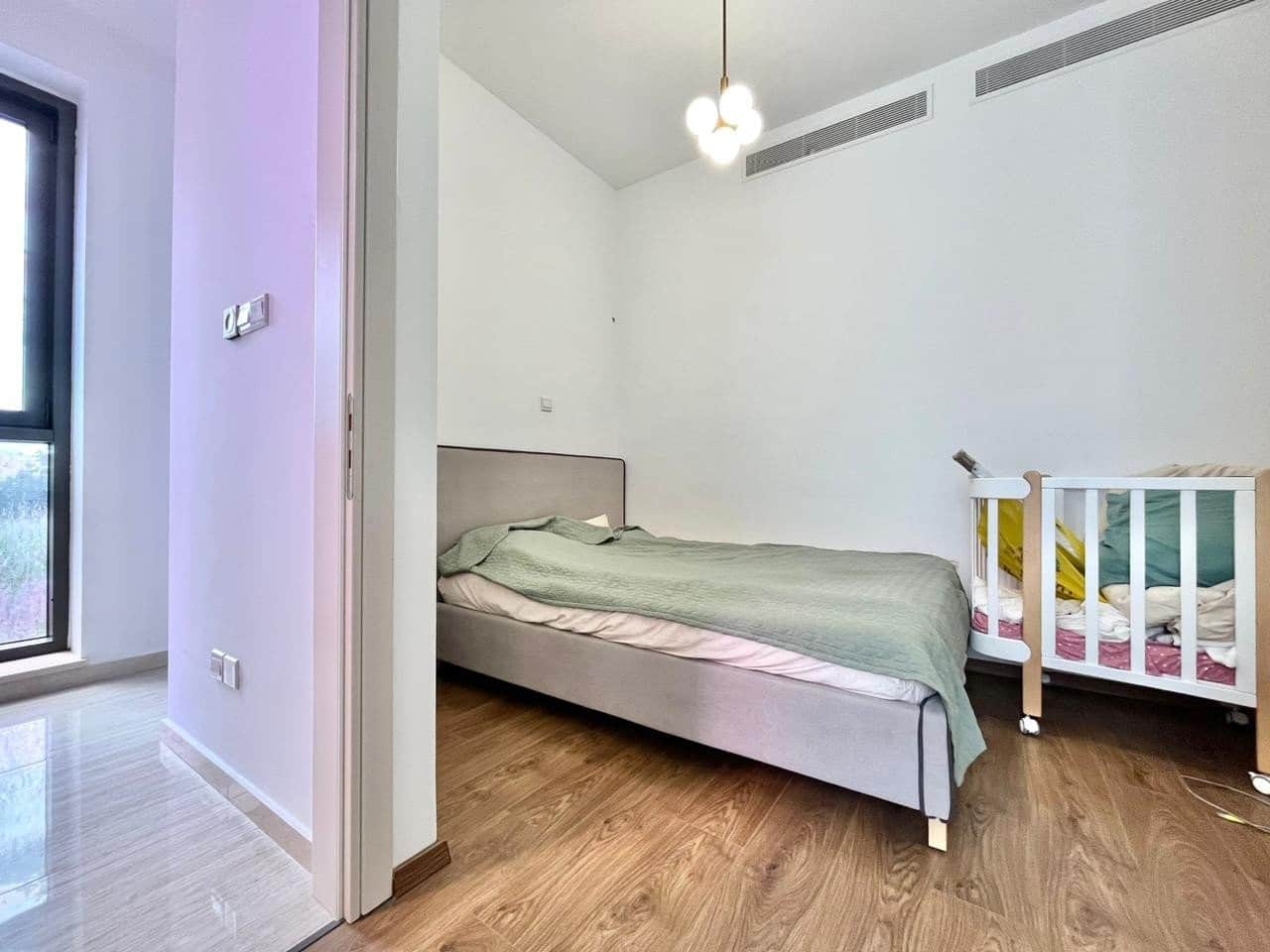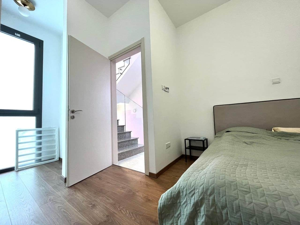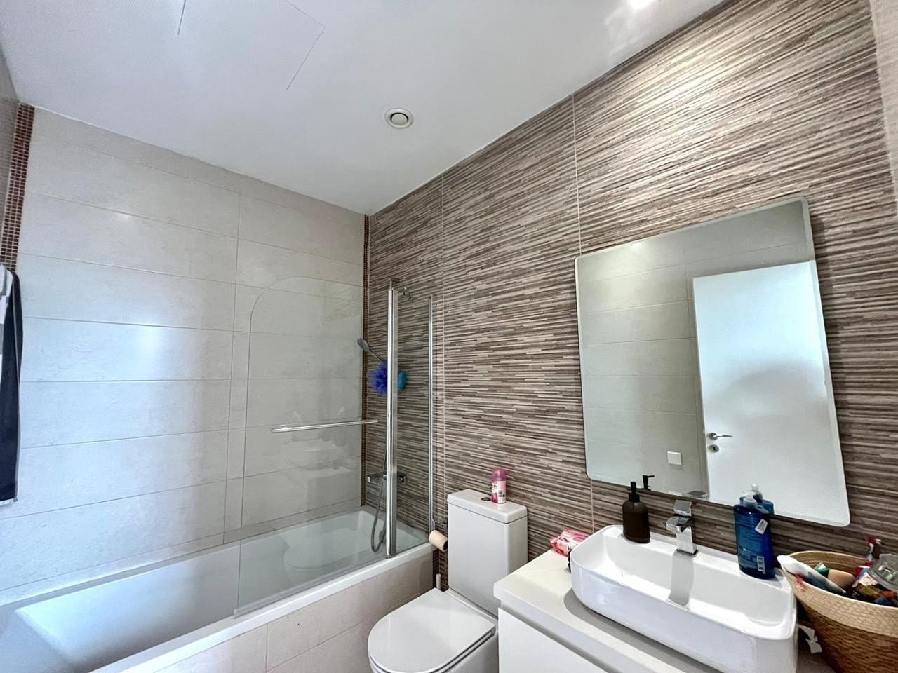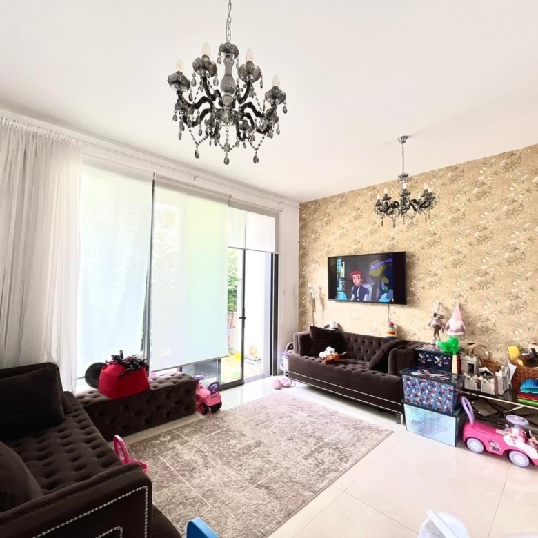 The complex features a swimming pool area surrounded by trees, with a wooden terrace equipped with sunbeds and umbrellas, creating an ideal spot to relax and soak up the warm Cyprus sunshine.