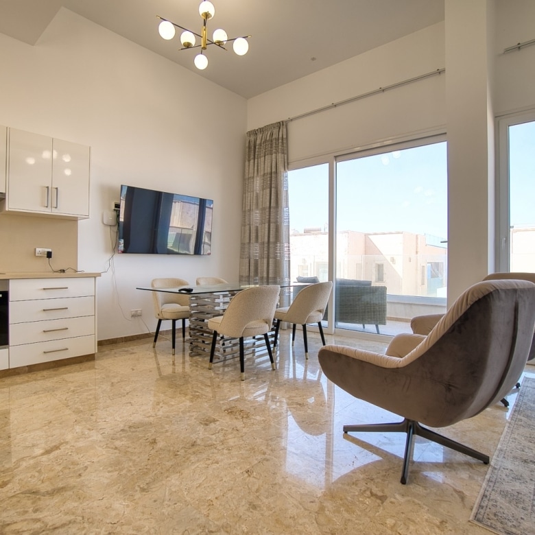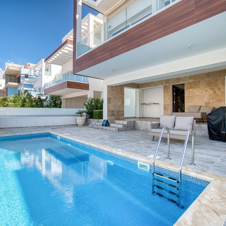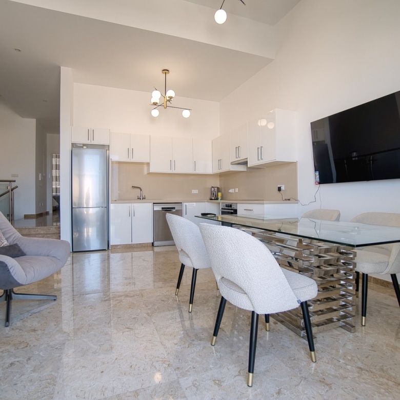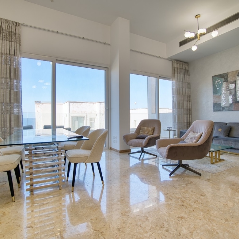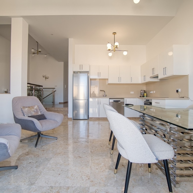 Two-level modern apartment with a private pool. Morning coffee in a comfortable chair overlooking the sea will help you forget about everyday problems and the city bustle of megacities. Huge windows and high ceilings create space, while bedding in flesh tones, orchids in beautiful vases and blankets make you feel at home with the smell of sea freshness and coolness. The sea and the beach are a 2-minute walk, a spacious balcony-patio overlooking the sea, two cozy bedrooms, each with its own bathroom, guest toilet, kitchen, elevator and stairs between two floors.