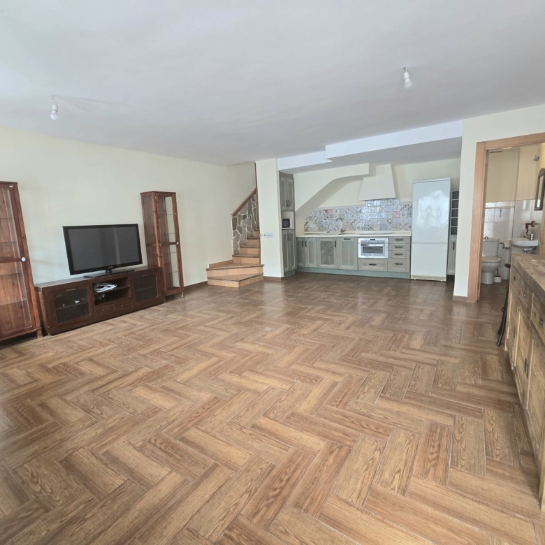 Accessed through a large patio with a separate office or storage room. Inside, there is a spacious living-dining room with large windows and a fully equipped open-plan kitchen, as well as a guest toilet. The south-east orientation ensures light throughout the day.