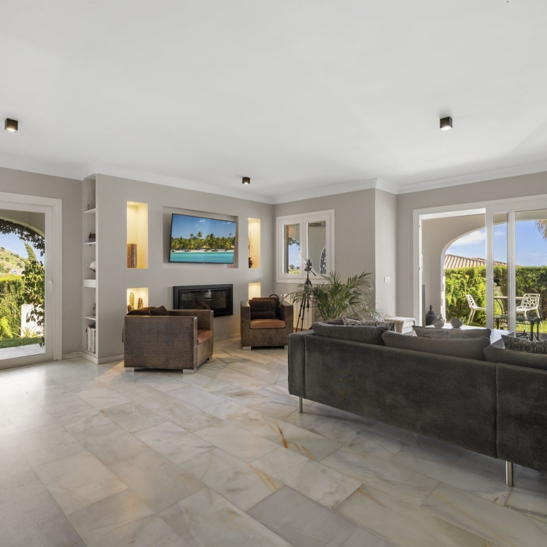 The entrance offers generous storage, a guest toilet, and a staircase to the upper level. The spacious, light-filled living room features a cozy fireplace and opens onto covered terraces and a lush garden. A sleek, modern kitchen with Siemens built-in appliances is perfect for cooking and entertaining. From the south-facing garden and covered terrace with built-in BBQ you can enjoy spectacular sea views. Your private garden – maintained by the community, so low maintenance for you – leads directly to the communal gardens and a beautiful communal pool just 30 meters away.