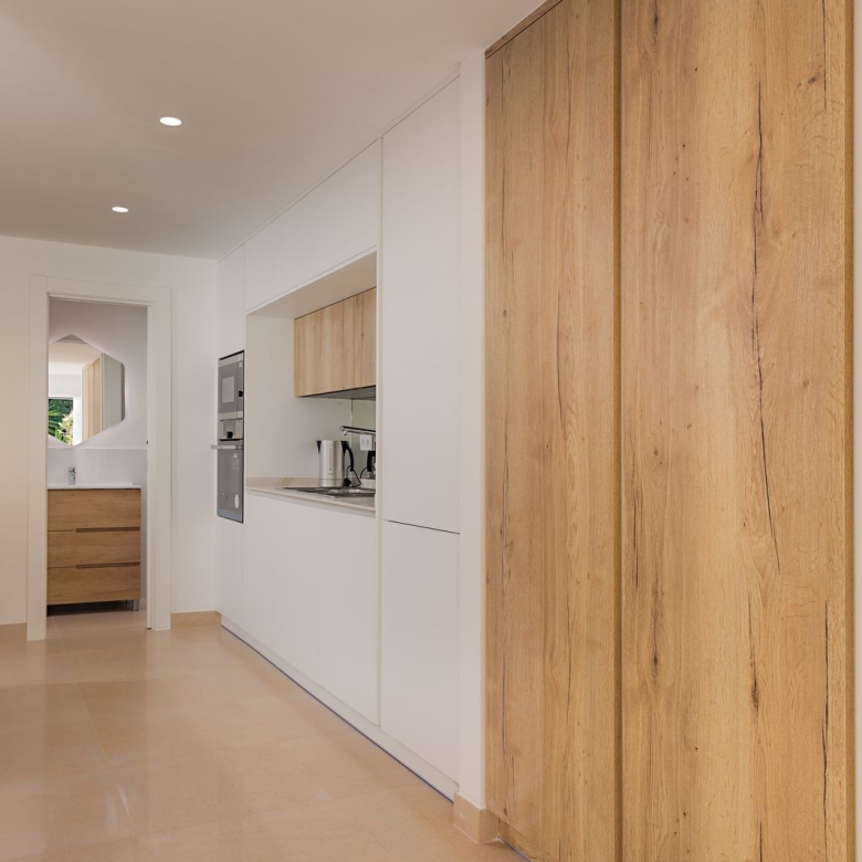 Upon entering, a private parking area next to the front door offers maximum convenience. The first floor features a fully equipped modern kitchen, separate laundry room with washing machine and a guest toilet. The spacious living room, with large windows, opens onto a sunny terrace and private garden overlooking the golf course.
