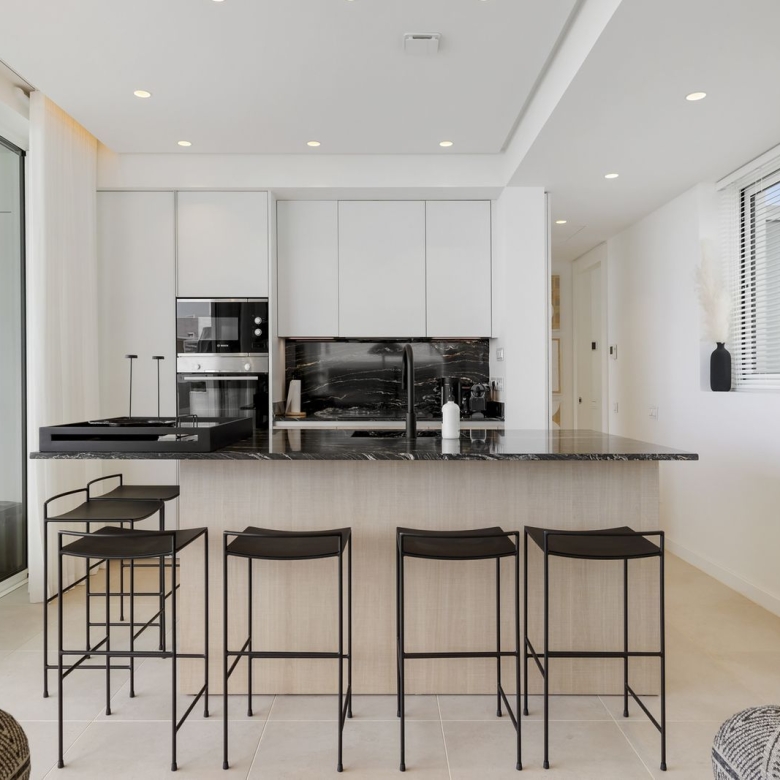 On the main floor, you’ll find a fully equipped independent kitchen with a separate laundry area, and a large living-dining room with direct access to a 25 m² terrace, partially enclosed with LUMON glass curtains. From here, you can enjoy open views of green areas and the communal pools.