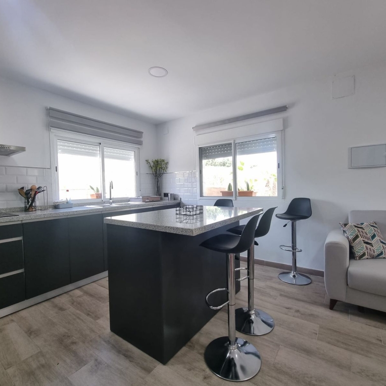The thoughtful layout enhances everyday living: step into a welcoming entrance patio on the ground floor, then ascend to the first floor’s expansive living-dining area, complete with a fireplace, a fully equipped kitchen with laundry, and three bedrooms with fitted wardrobes—one opening to a versatile terrace perfect for an office or playroom. The second floor features a private bedroom leading to a spectacular open terrace with an outdoor kitchen, solarium, and a dedicated space for solar panels, ideal for entertaining or relaxing under the stars.