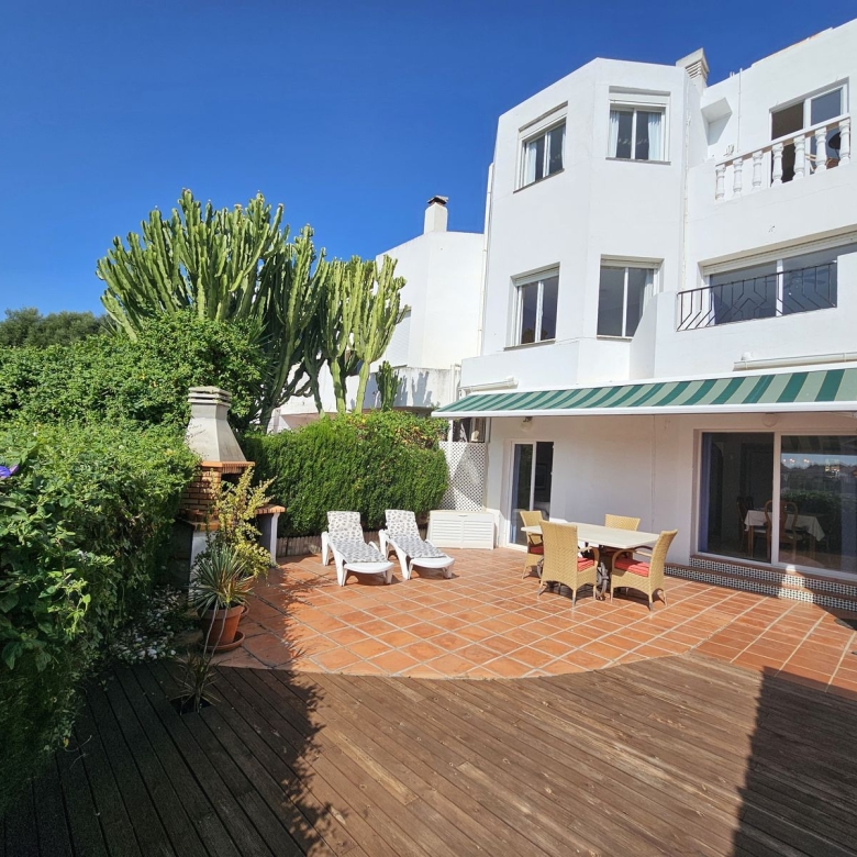 This well presented Andalucian style house is located in a gated community next to Resina Golf and walking distance to the beach, local golf and sports club. The house has a really warm and charming feel to it. It is bright with plenty of natural light and the private terrace/garden creates a little oasis of calm surrounded by tropical plants. The property has 3 large bedrooms, 3 ensuite bathroom and a guest loo, spanning three floors with a fabulously quirky spilt level living room, elegant marble flooring and amazing outside area with pergola and BBQ. There is a self contained apartment on the upper level with spacious double bedroom, ensuite bathroom, kitchen, sitting room and terrace. On the mid level your will find the large second bedroom with bay windows giving plenty of natural light, an ensuite bathroom plus a large master bedroom suite with walk in wardrobe, large ensuite bathroom and a lovely terrace with golf, mountain and sea views. Downstairs, on the lower level. you will find the split level living and dining room that flows straight out onto the fantastic large terrace which is ideal for alfresco dining, sunbathing and lazy summer siestas. The exterior can actually be extended making room for a private pool if required. The galley style kitchen, with separate utility room, also has direct access to the terrace which is ideal for easy outdoor dining. On this lower level there is also a store room, office and guest bathroom.