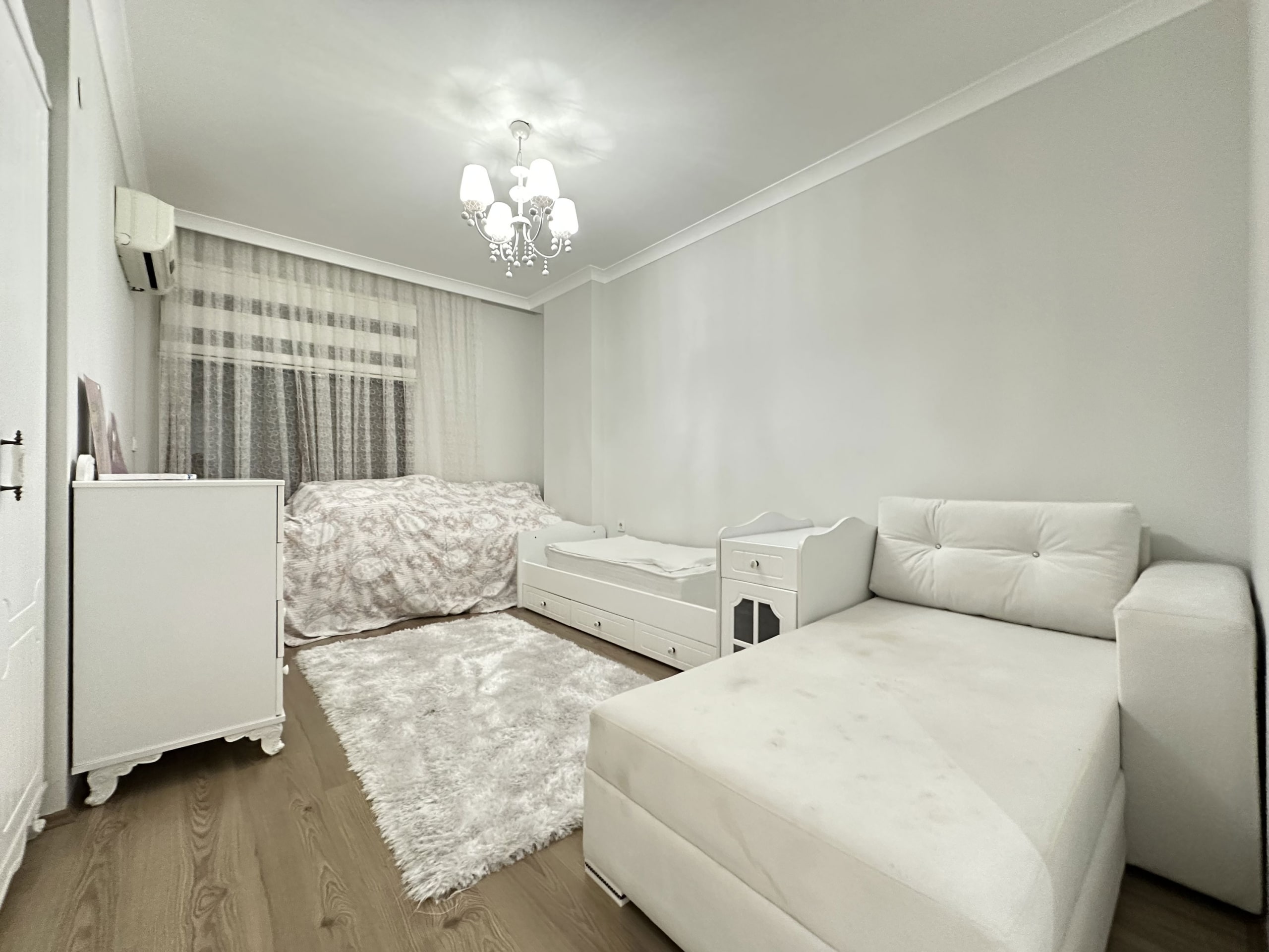 Moreover, large windows and sliding balcony doors allow sunlight to flood the room, making it bright throughout the day. Spotlights and a decorative chandelier complete the ceiling design.