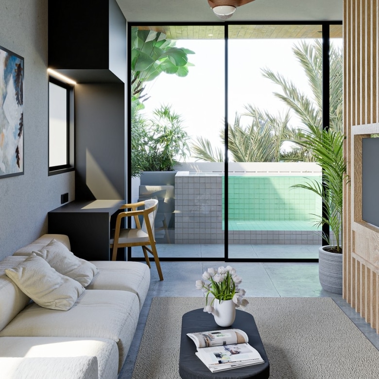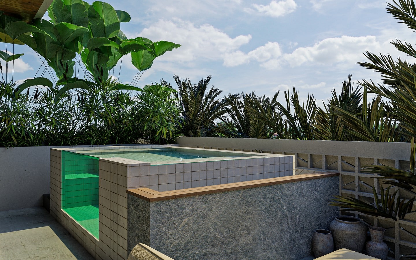 This 1-bedroom off-plan apartment perfectly captures the essence of Balangan’s allure. Set to complete by late December 2024, the apartment is part of a distinctive complex of villas and apartments, positioned on the top floor and facing west to offer breathtaking sunset views. The apartment spans a total of 85 sqm, with 50 sqm of enclosed living space and an expansive 35 sqm terrace complete with sunbeds and a private jacuzzi—ideal for unwinding while soaking in the stunning surroundings.