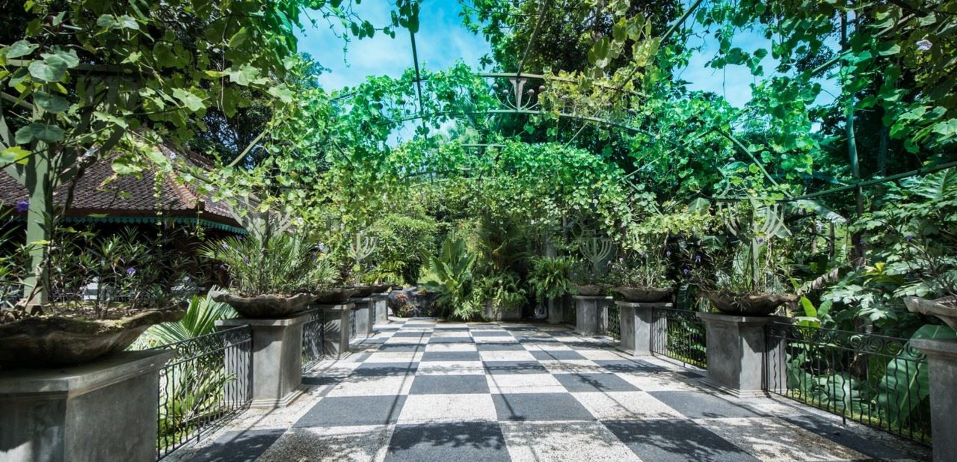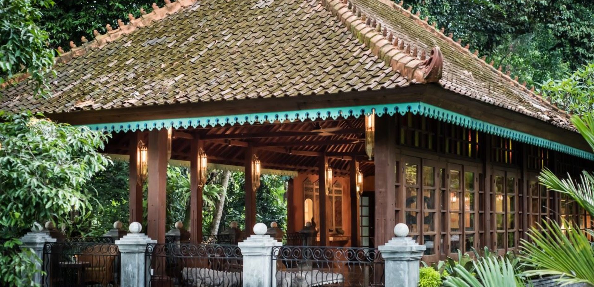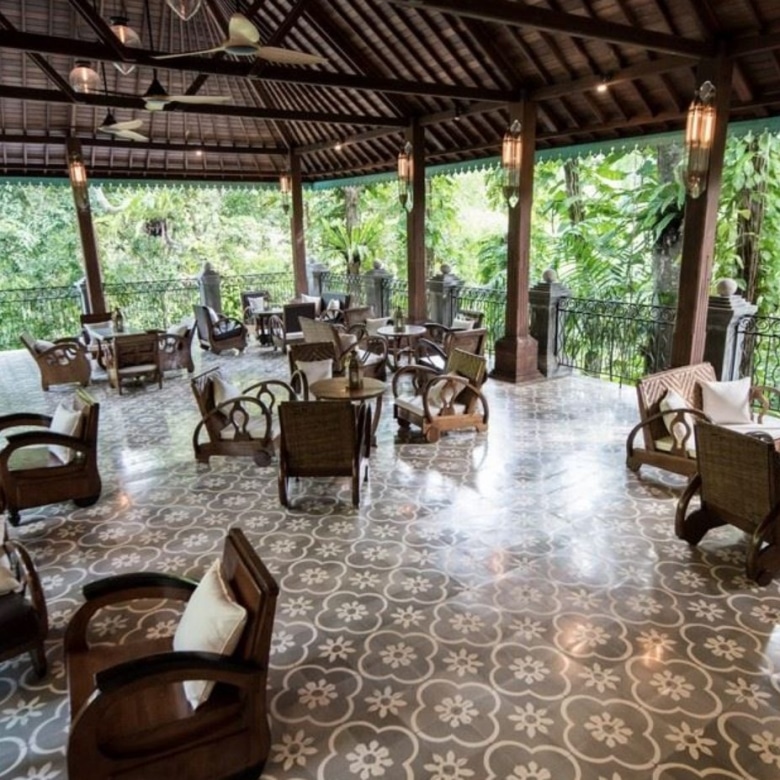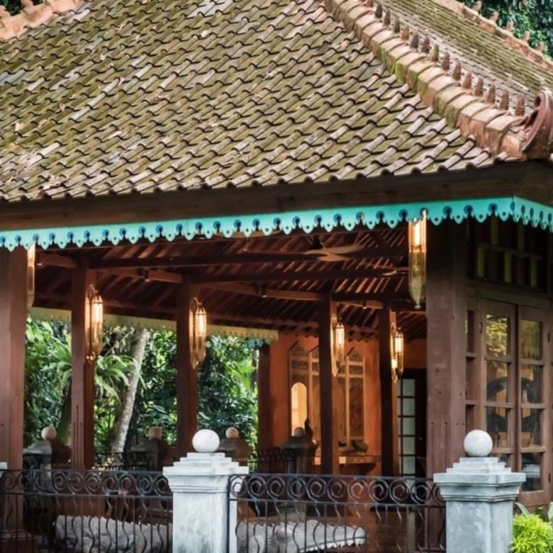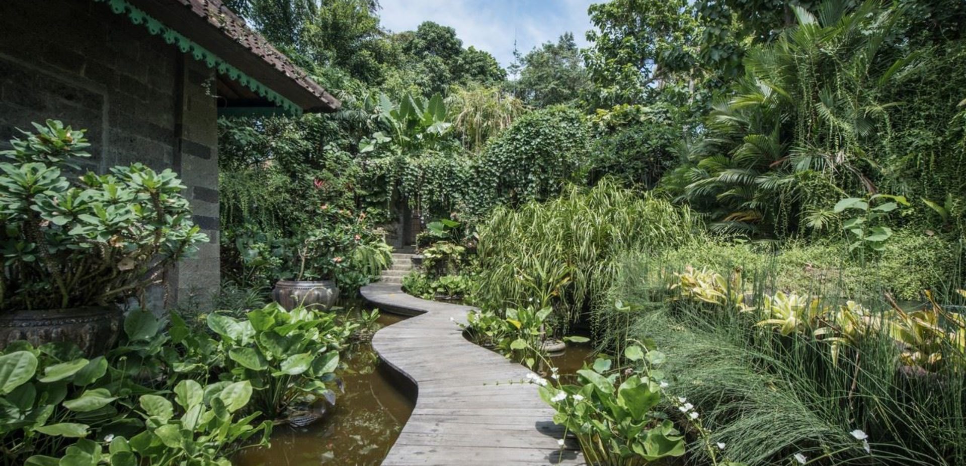 Visitors to this majestic property are in awe of the breathtaking panoramic views of an ancient river, framed by towering bamboos and the greenery of giant leafed tropical plants. The property consists of 2 pieces of land on either side of this river coursing through 5 metre walls of aged paras stone, the two sides connected by a romantic 12-metre bridge featuring steel art deco railings and carved columns. With a bridge view of tumbling rapids on one side, the other sees the river spreading out into a lazy crawl, creating relaxing water sounds with no signs of trash on the riverbed.