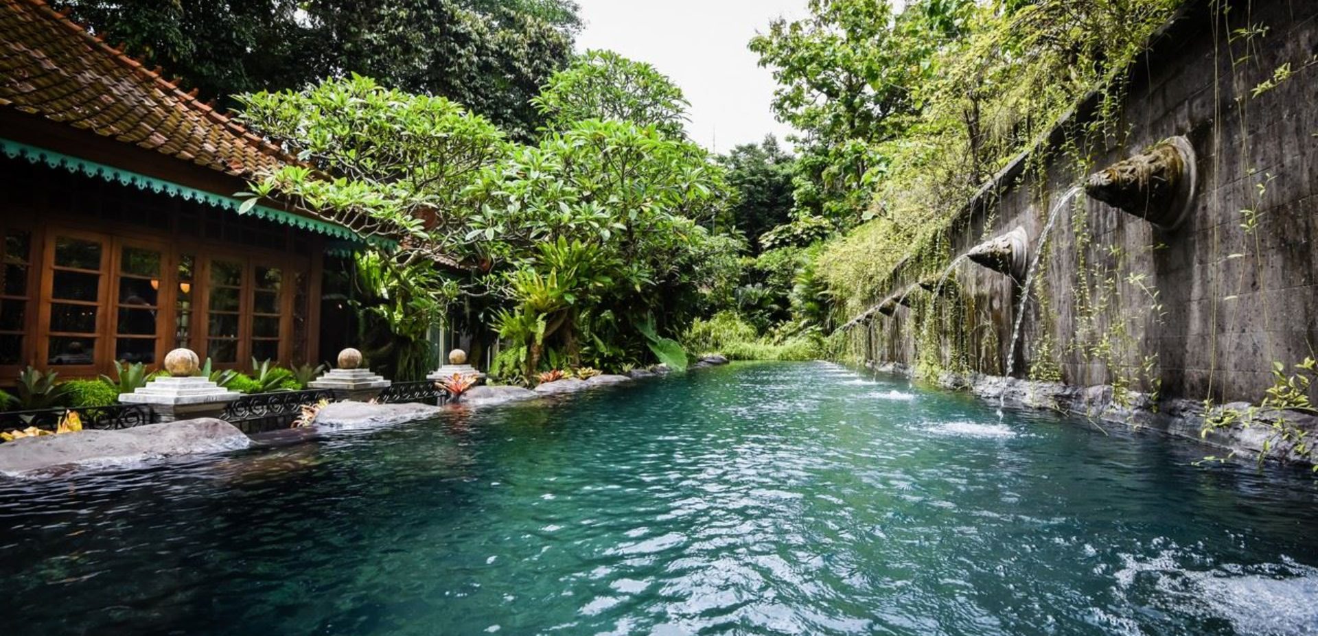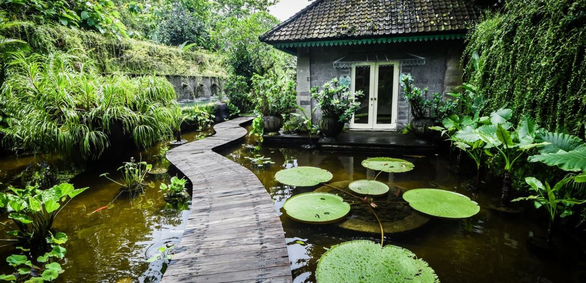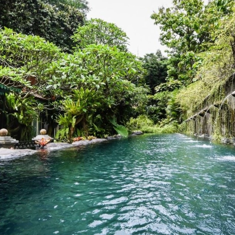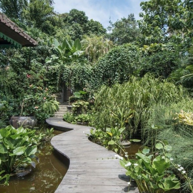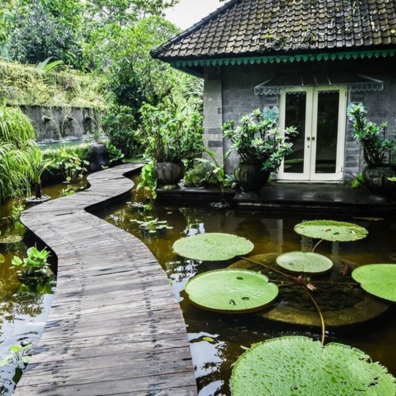 The impressive teak and bronze studded entrance doors mark the beginning of a journey into this amazing property passing a 30-metre spring water swimming pool, adorned with carved fountainheads reminiscent of Tirta Empul Temple. Two stone lions guard a curving walkway flanked either side by water-lily ponds. Going down the 42 hand-carved steps will take you to an open veranda which seamlessly transitions into the natural landscape.