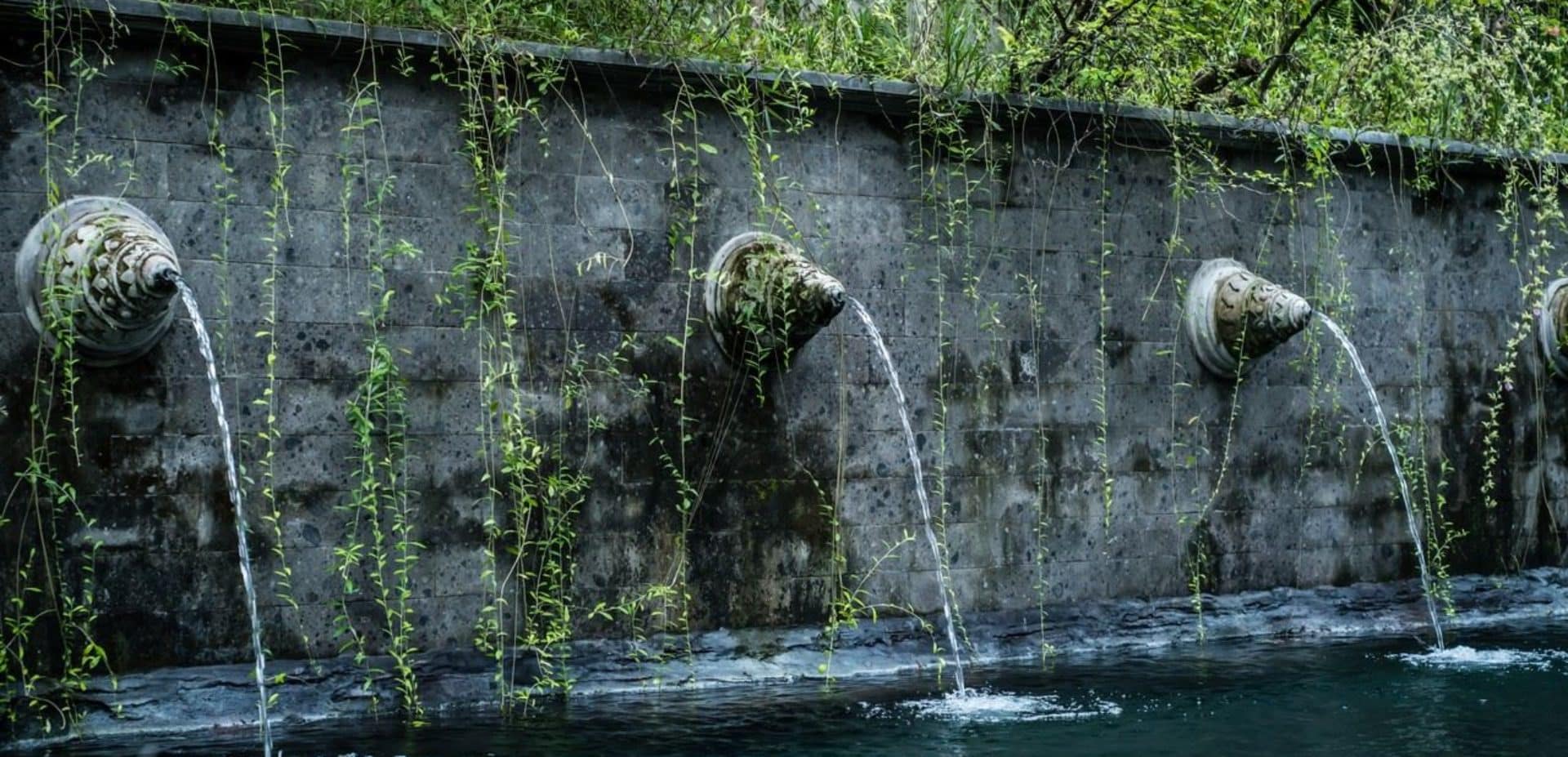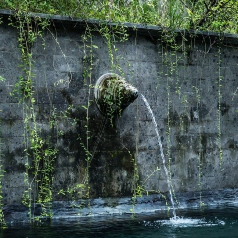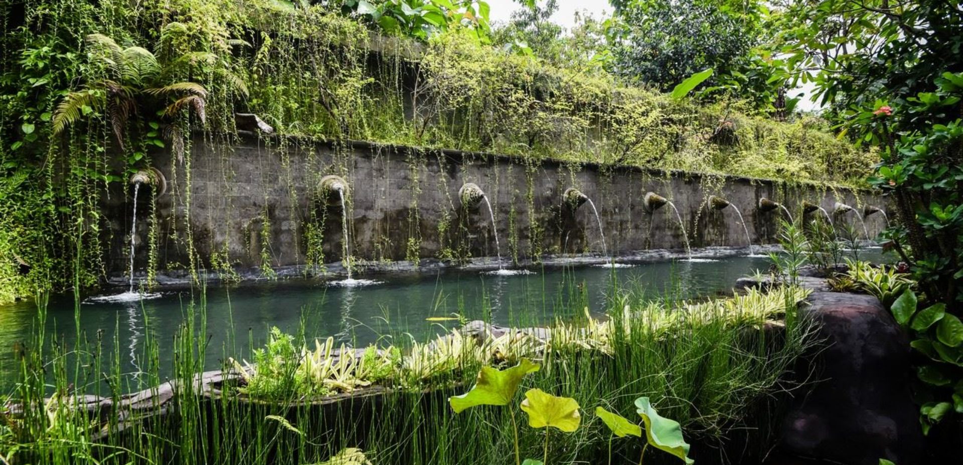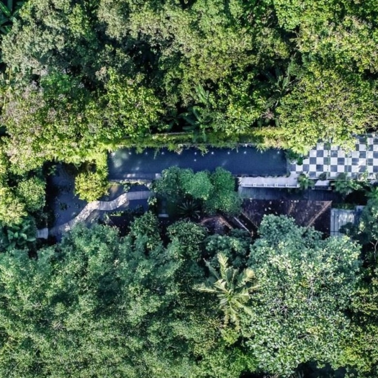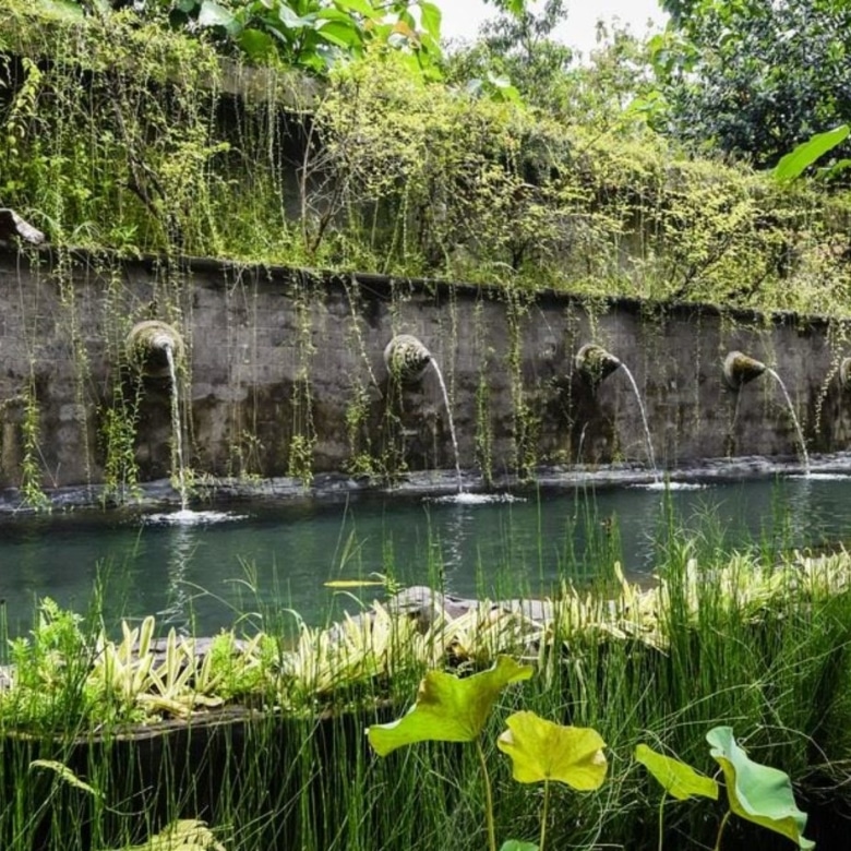 The impressive teak and bronze studded entrance doors mark the beginning of a journey into this amazing property passing a 30-metre spring water swimming pool, adorned with carved fountainheads reminiscent of Tirta Empul Temple. Two stone lions guard a curving walkway flanked either side by water-lily ponds. Going down the 42 hand-carved steps will take you to an open veranda which seamlessly transitions into the natural landscape.