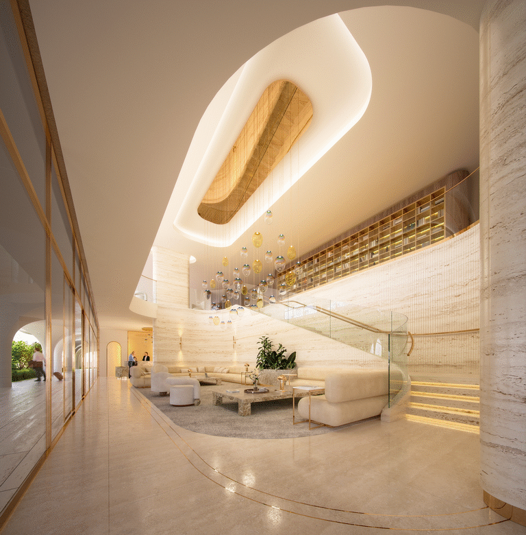 Hotel-style lobby, high-speed elevators, and art-curated interiors